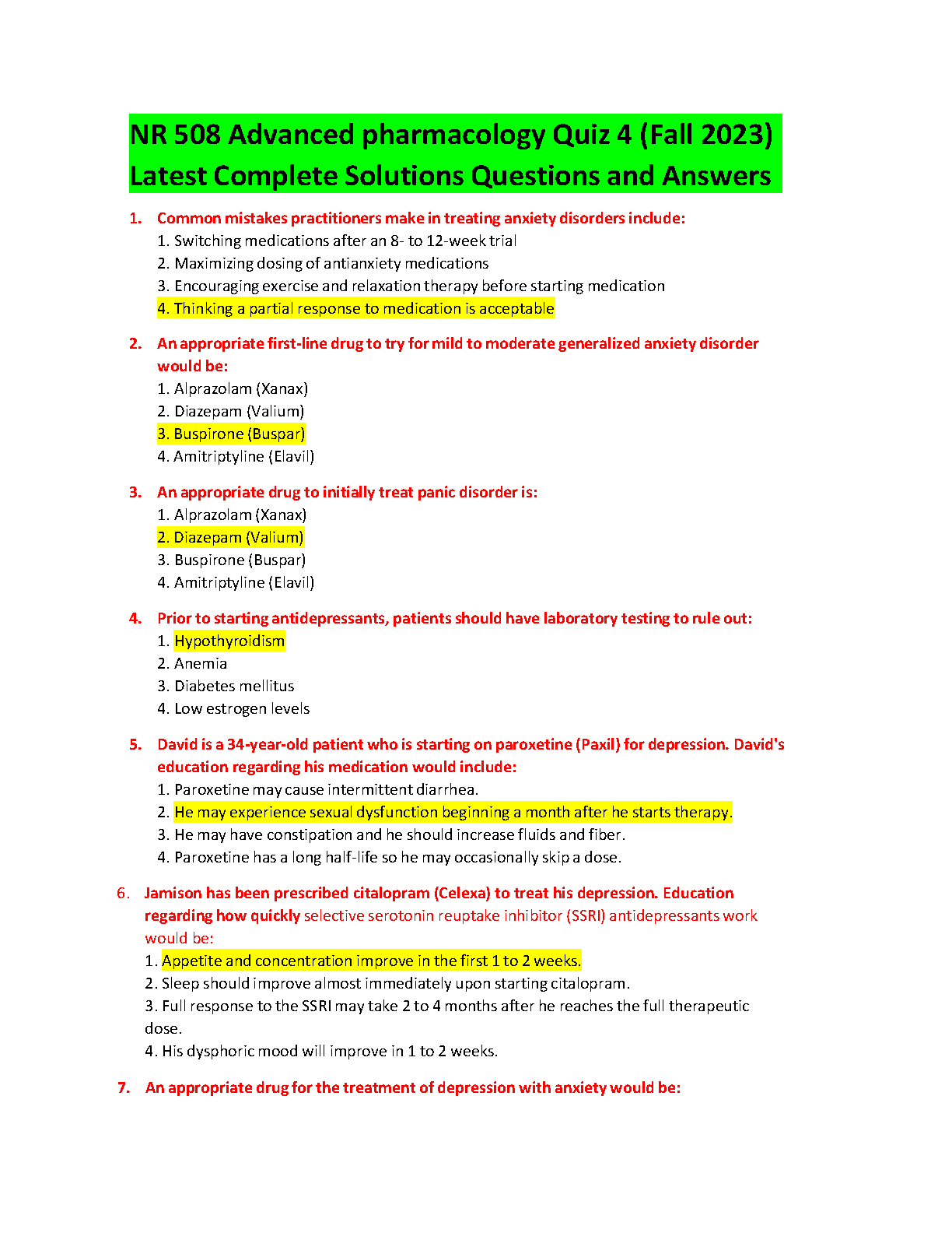 Get ready for your NR 508 Advanced Pharmacology Quiz 4 with this comprehensive set of solutions and answers! This resource covers the most recent edition of the course and provides a detailed breakdown of each question, helping you ace your exam.
