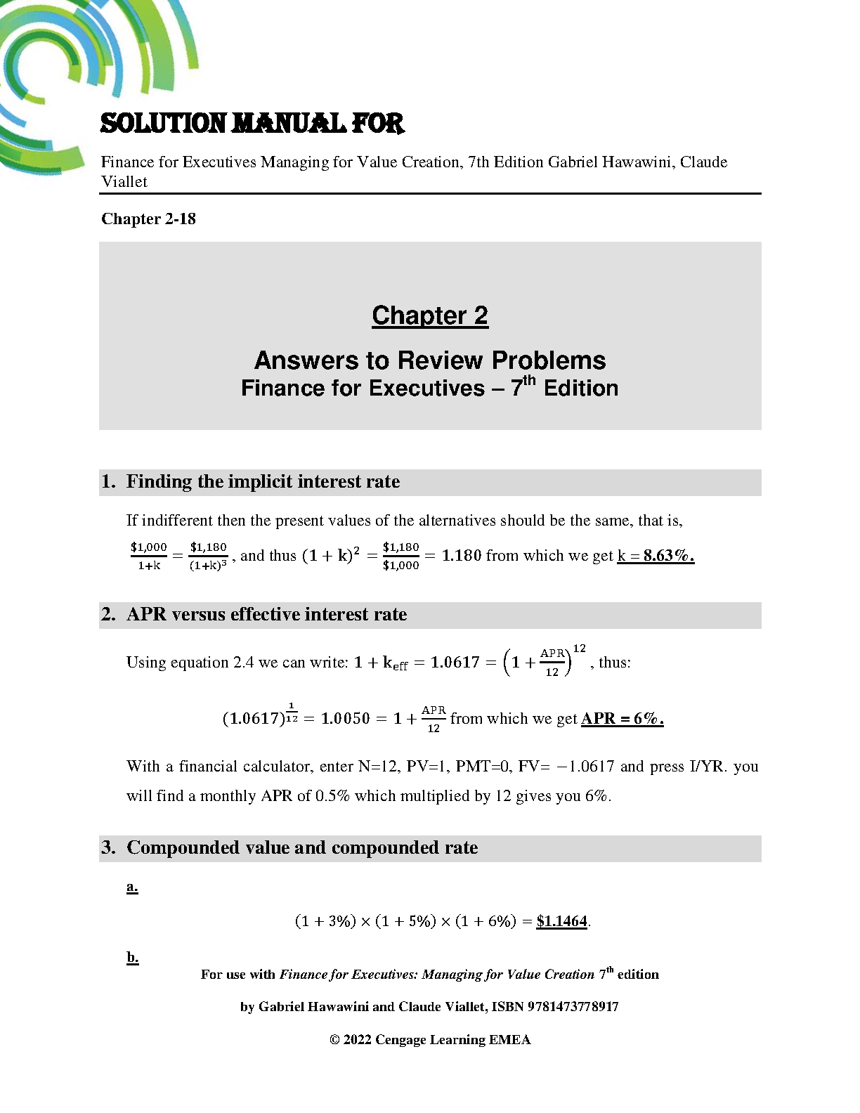 Enhance your understanding of Finance for Executives Managing for Value Creation, 7th Edition by Gabriel Hawawini and Claude Viallet with this comprehensive solution manual. This invaluable resource provides detailed solutions to all end-of-chapter problems, ensuring a deeper grasp of key concepts and a boost to your academic success.