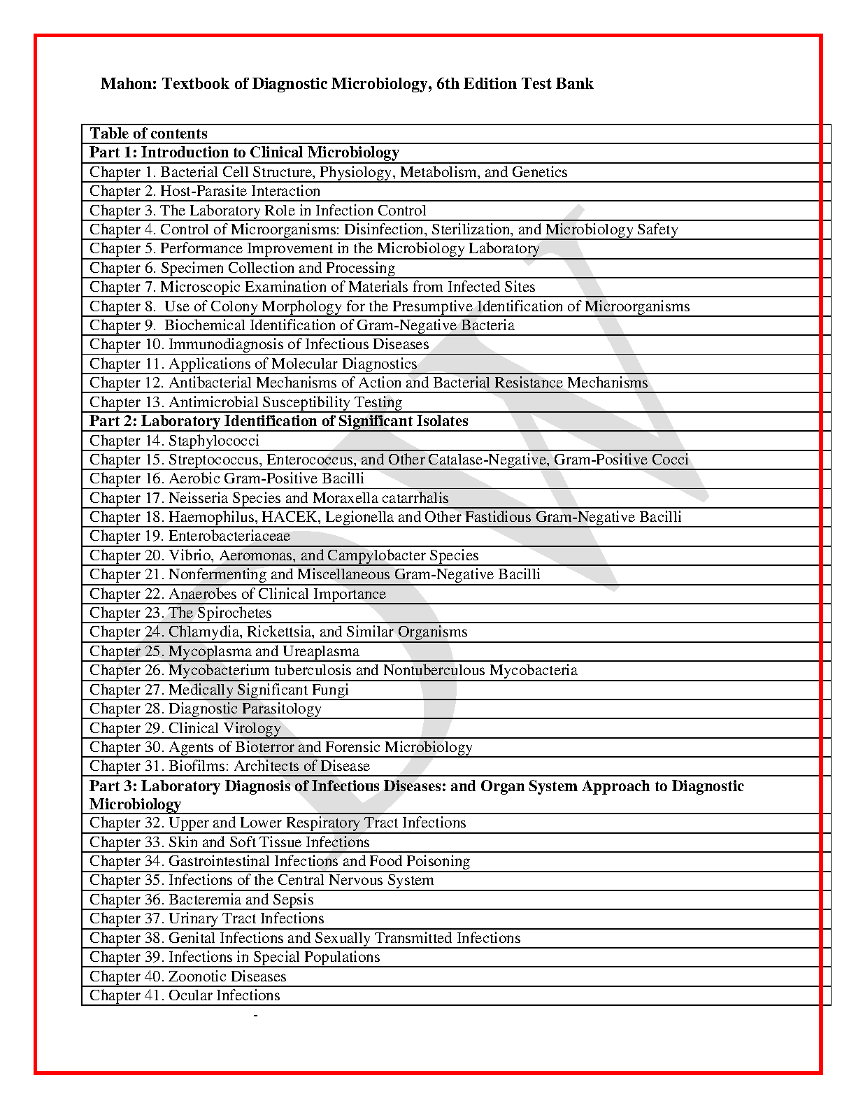 This is the 6th edition of the Test Bank for Textbook of Diagnostic Microbiology by Connie R. Mahon and Donald C. Lehman. It provides a comprehensive guide for students and instructors to assess their understanding of key concepts in diagnostic microbiology.
