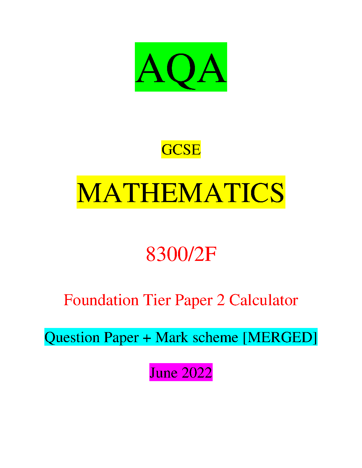 AQA GCSE Mathematics 8300/2F June 2022 Foundation Tier Paper 2 Calculator (Merged) Question Paper and Mark Scheme. This resource is perfect for students looking to ace their exams and avoid resits.