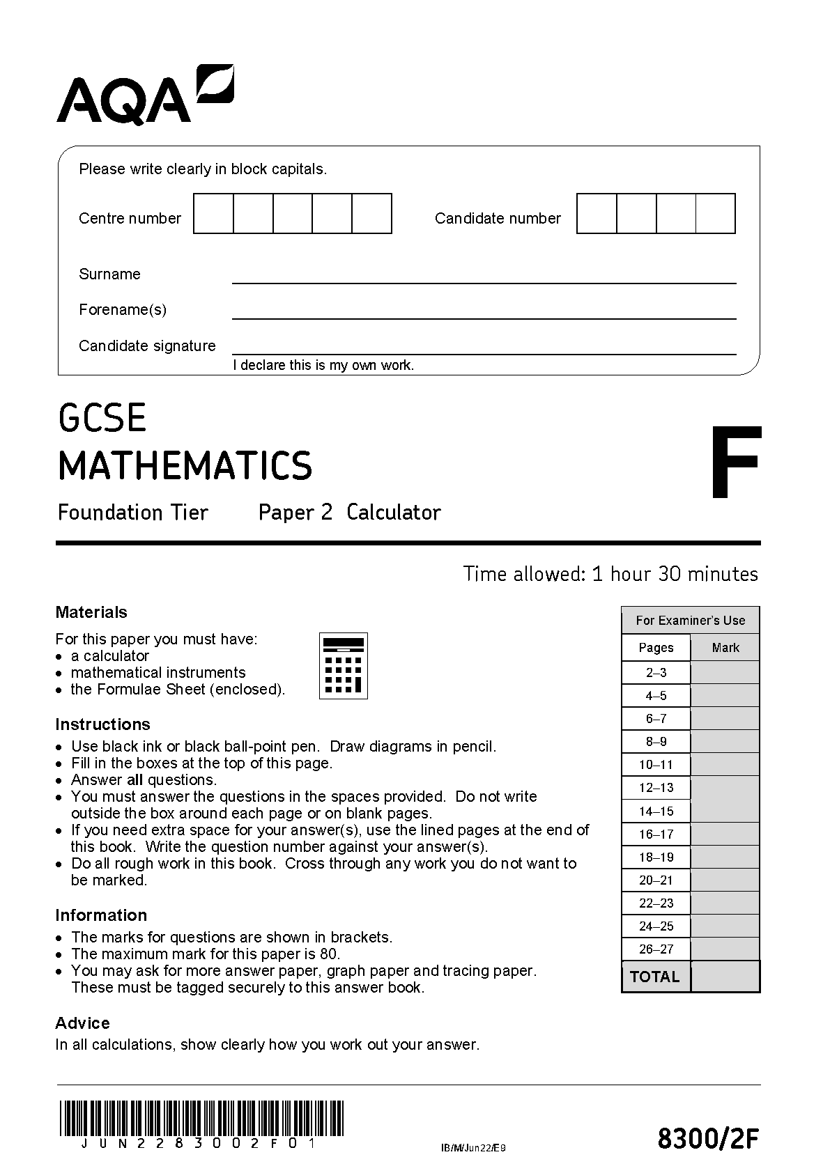 AQA GCSE Mathematics 8300/2F Foundation Tier Paper 2 Calculator June 2022 Question Paper and Mark Scheme (Merged)