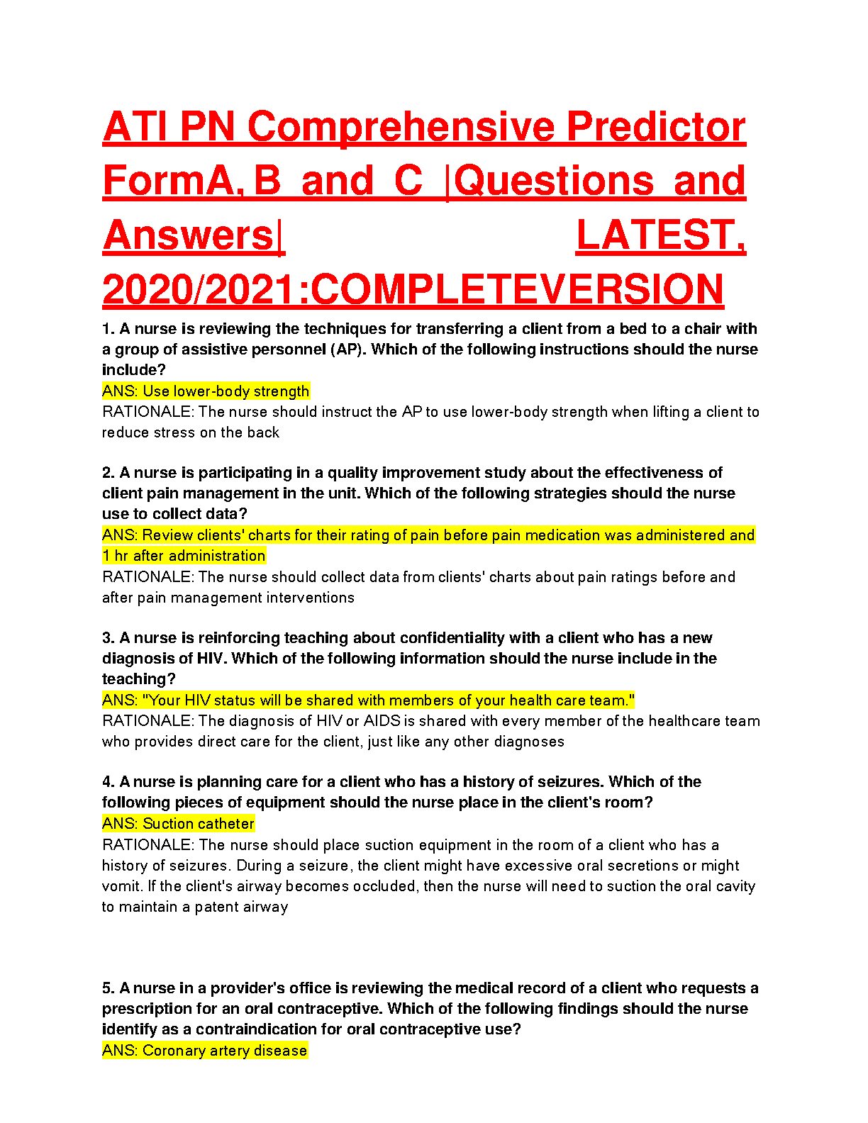 ATI PN Comprehensive Predictor Form A, B and C Questions and Answers 2020/2021: COMPLETE VERSION - Latest Edition