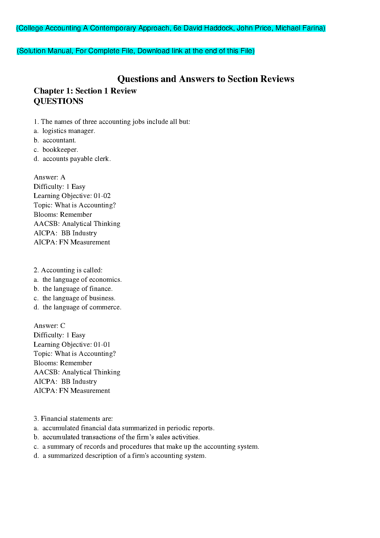College Accounting: A Contemporary Approach, 6e - David Haddock, John Price, Michael Farina - Solution Manual