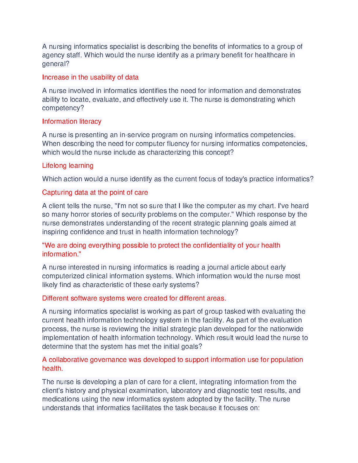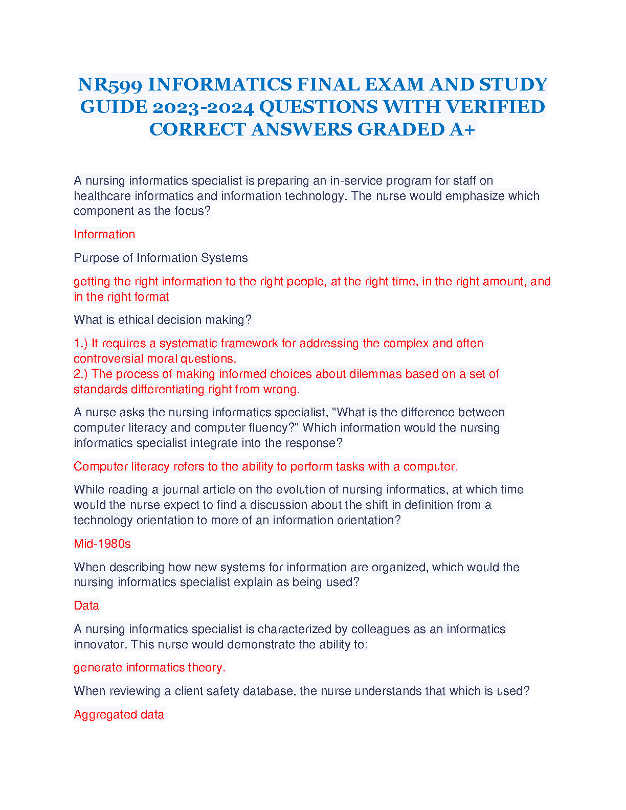 NR599 Informatics Final Exam and Study Guide 2023-2024 Questions with Verified Correct Answers Graded A+ - by [Complete author names]
