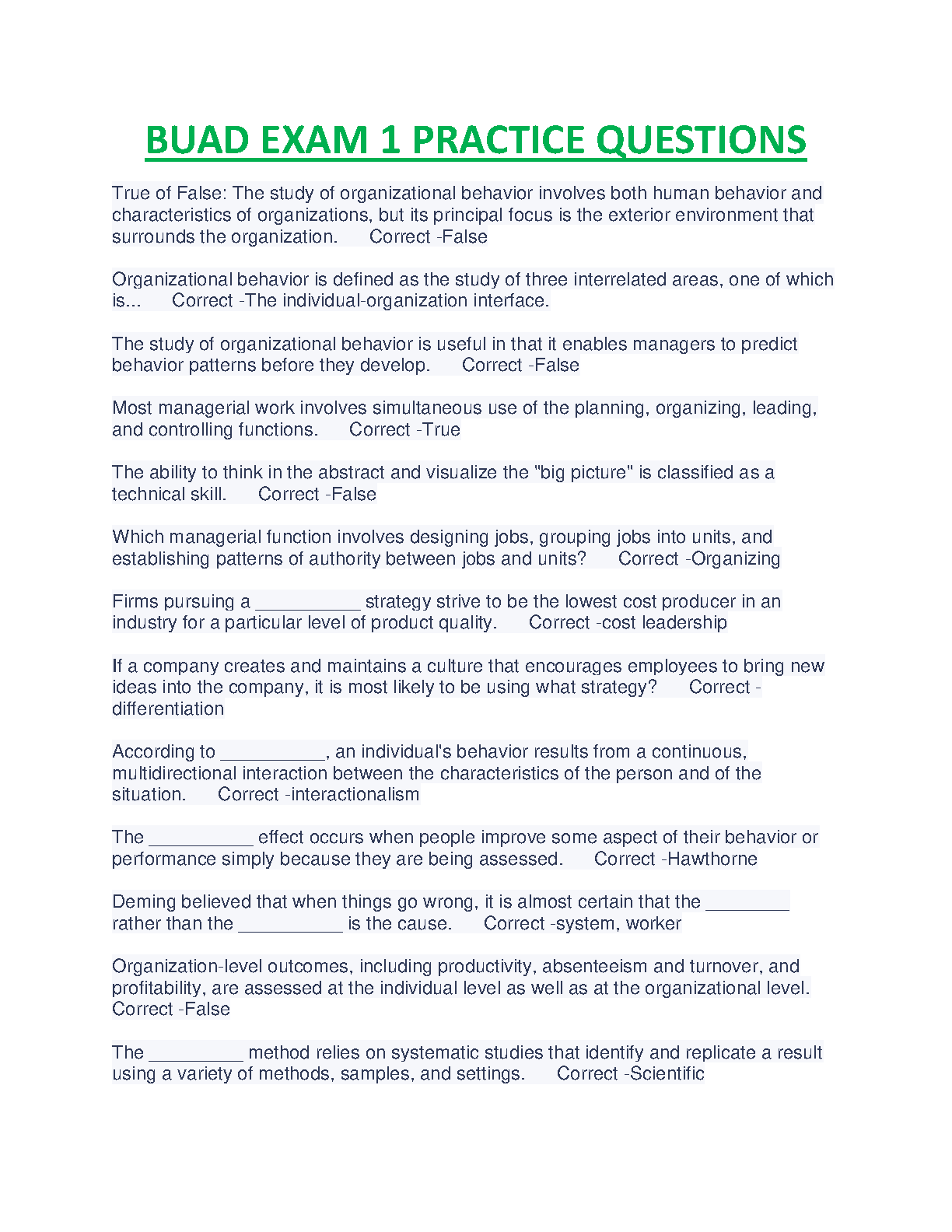 BUAD Exam 1 Practice Questions: A Comprehensive Guide to Organizational Behavior by Stephen P. Robbins and Timothy A. Judge, 19th Edition