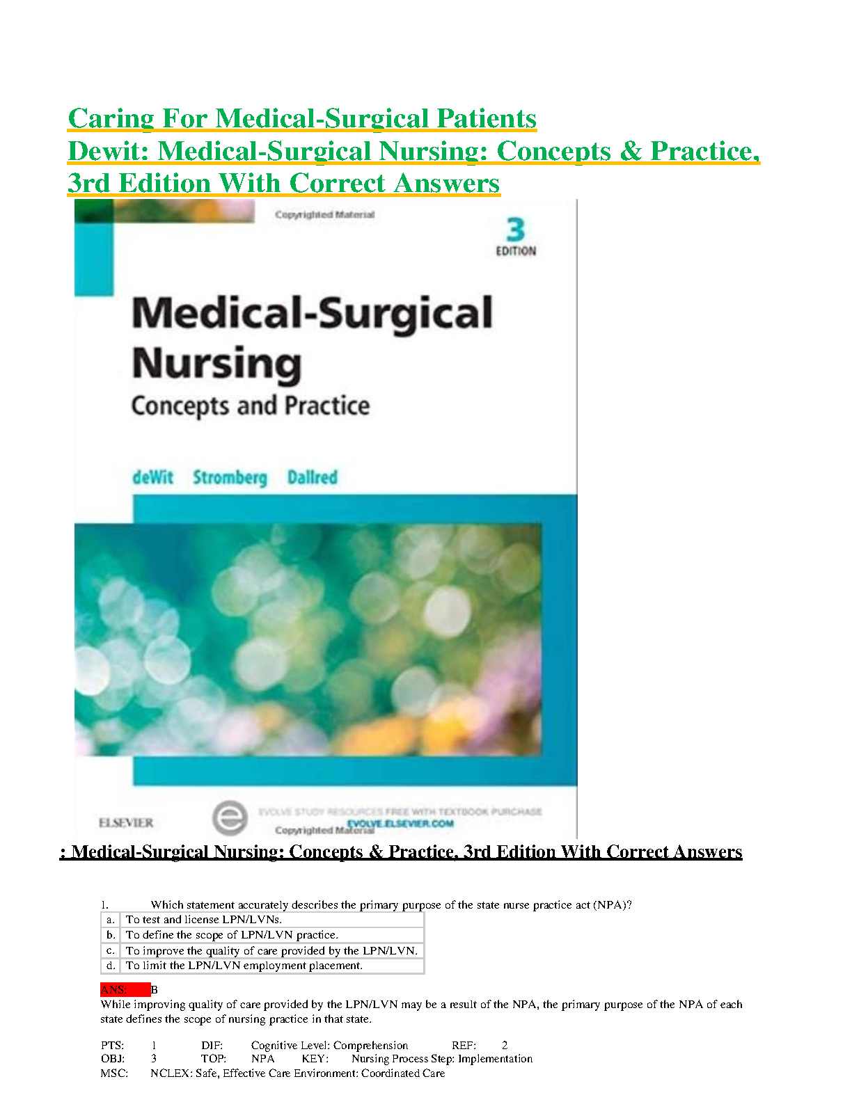 Enhance your nursing knowledge with this comprehensive solution manual for the 3rd edition of "Medical-Surgical Nursing: Concepts & Practice" by Carolyn deWit, Patricia Stromberg, and Mary Ann Dallred. Get access to detailed answers and explanations for every question in the textbook, ensuring you understand the concepts and can confidently ace your nursing exams.