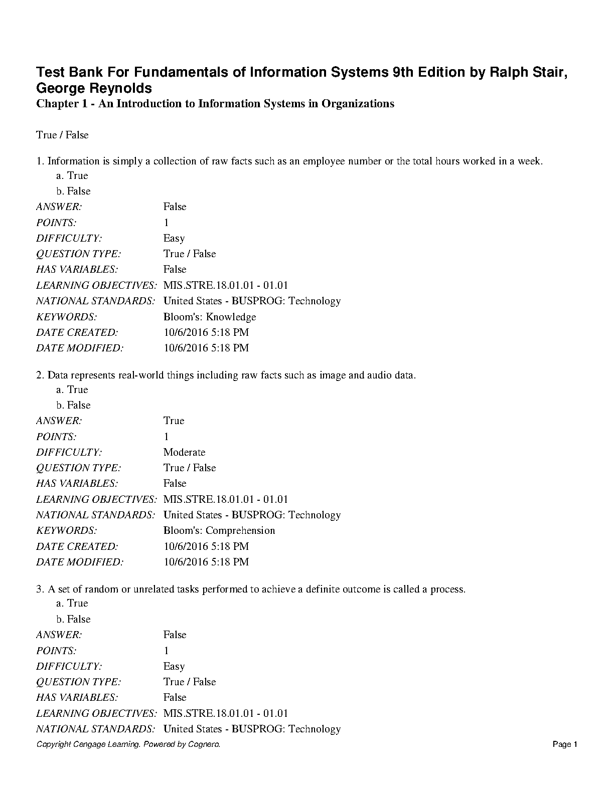 Test Bank for Fundamentals of Information Systems 9th Edition by Ralph Stair, George Reynolds