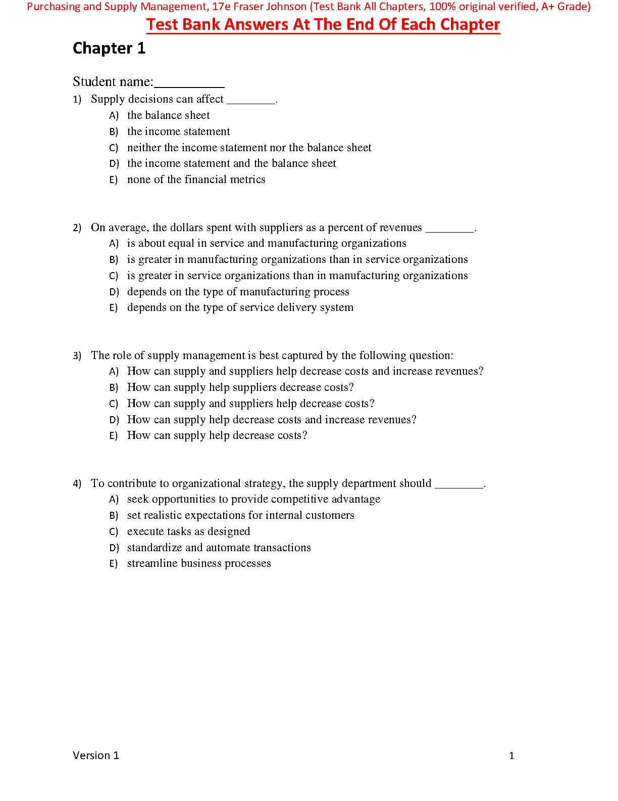 Purchasing and Supply Management, 17e: Test Bank Answers by Fraser Johnson - 2024/2025 Edition: Ace Your Exams with Guaranteed Success