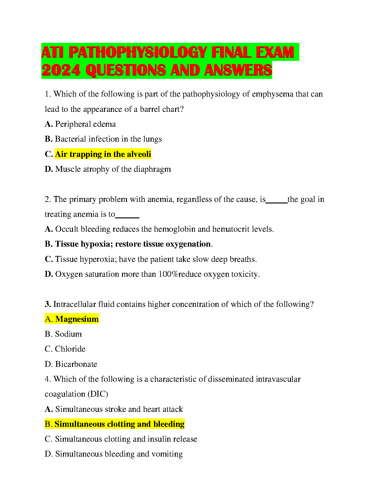ATI Pathophysiology Final Exam 2024 Questions and Answers - Latest Edition for Passing Exams on the First Attempt
