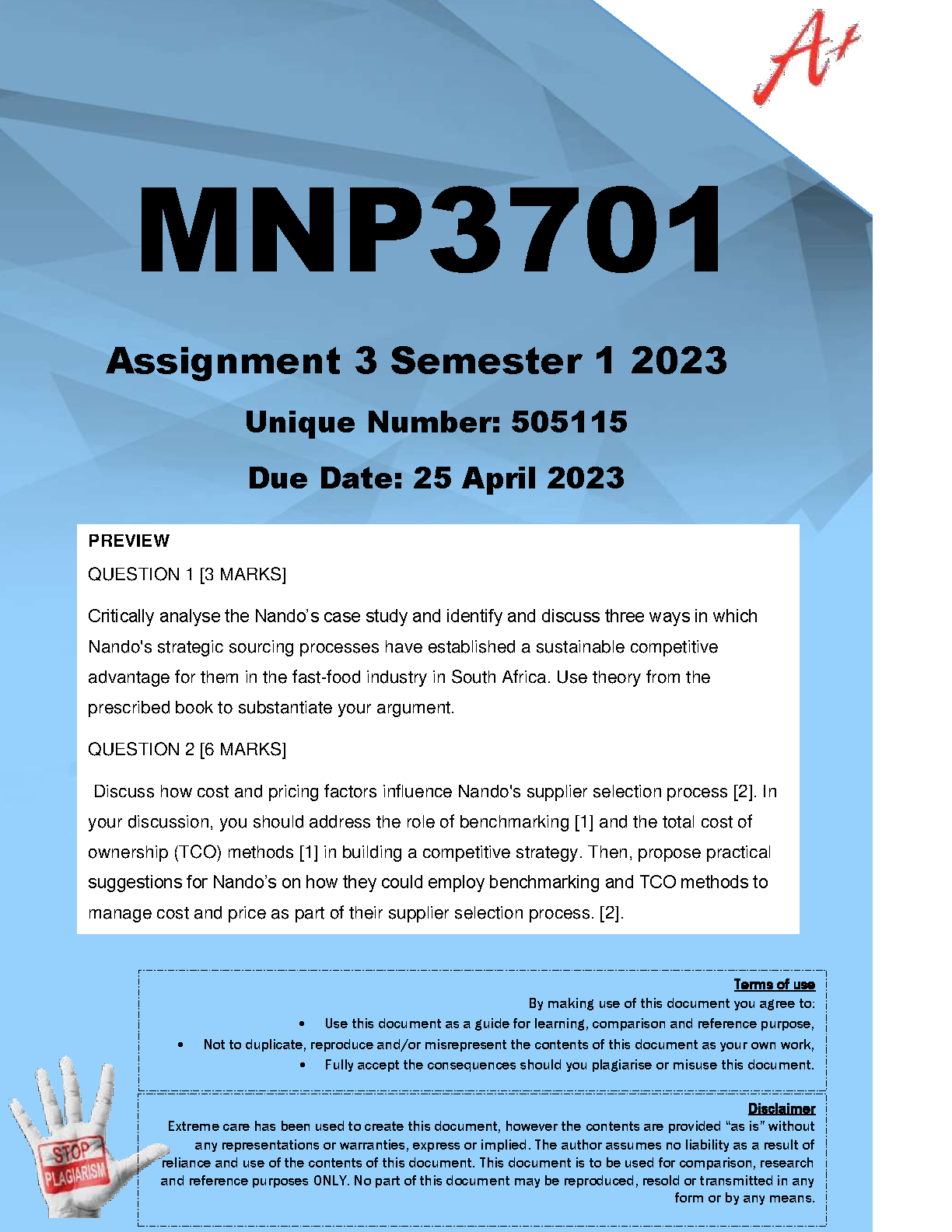 This resource is designed to help students prepare for their MNP3701 exams and achieve success on their first attempt. It covers the critical analysis of Nando's case study and explores three ways in which their strategic sourcing processes have contributed to a sustainable competitive advantage in the fast-food industry in South Africa.