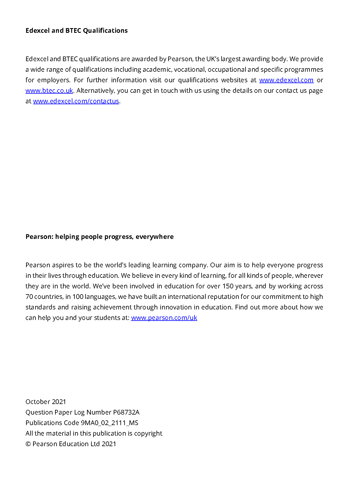 Pearson Edexcel GCE in Mathematics (9MAO) - October 2021 Paper 02 Pure Mathematics 2 Mark Scheme
