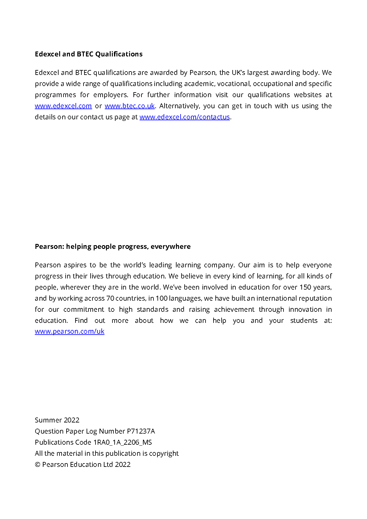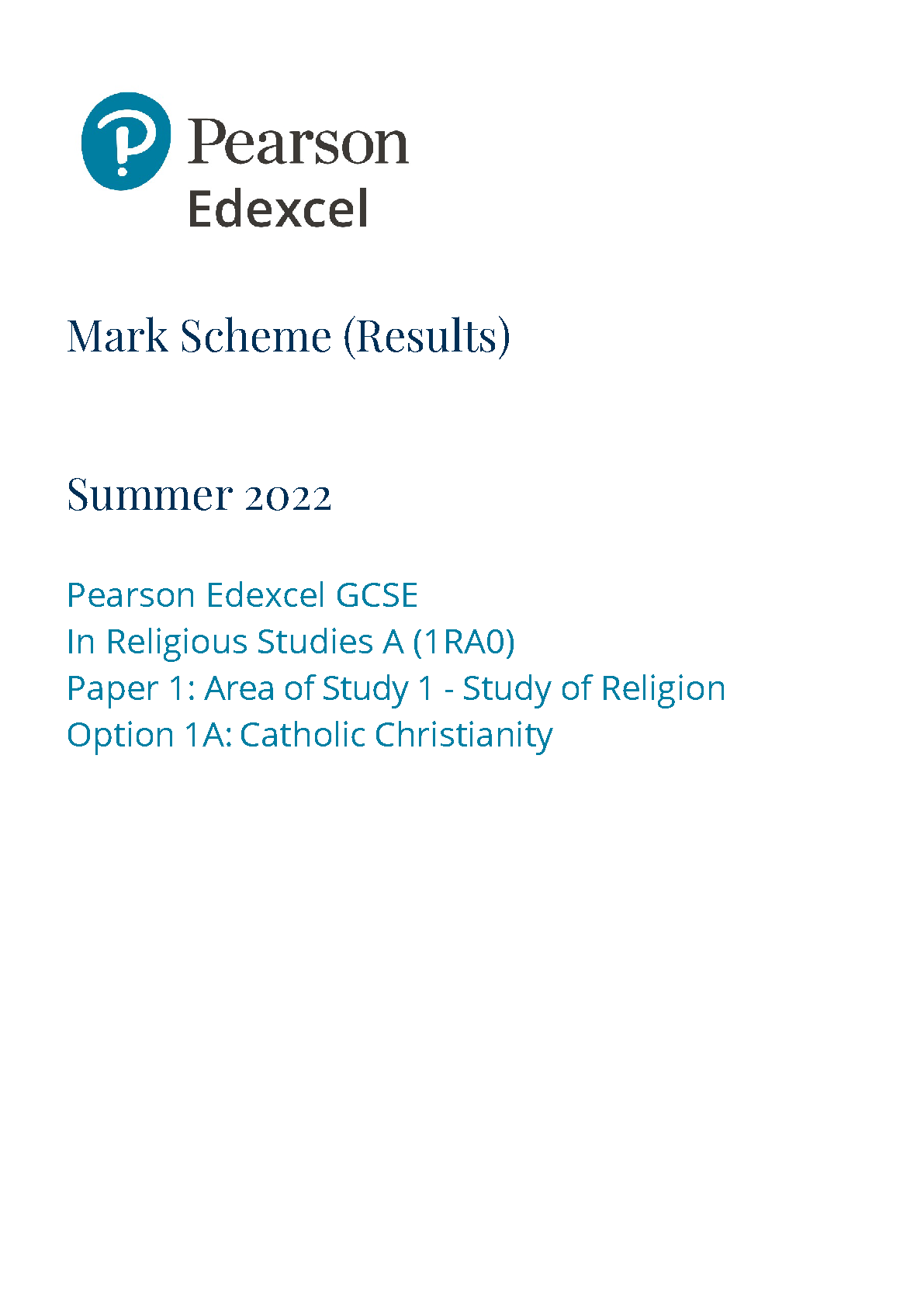 Edexcel GCSE Religious Studies A (1RA0) Summer 2022 - Mark Scheme (Results) for Paper 1: Area of Study 1 - Study of Religion - Option 1A: Catholic Christianity