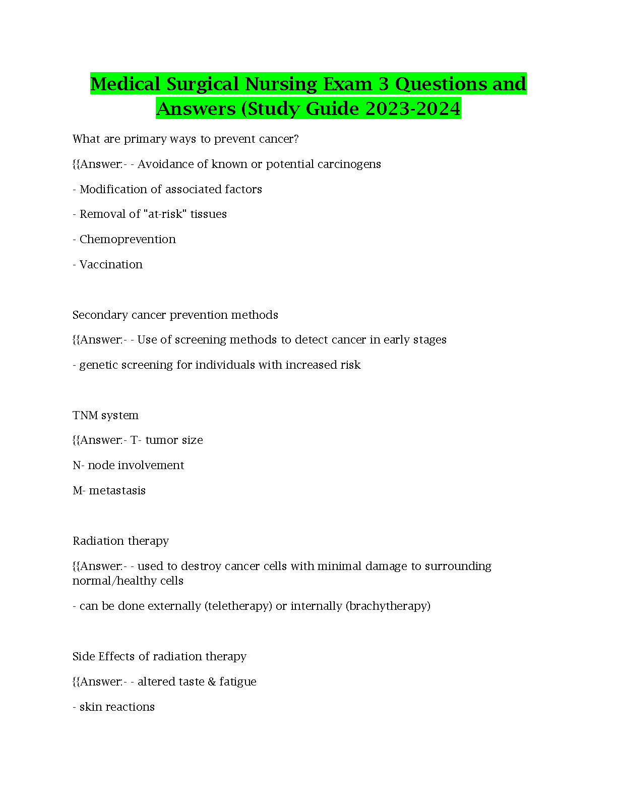 This comprehensive study guide for Medical Surgical Nursing Exam 3 will help you ace your exam on the first attempt and avoid resits. It includes questions and answers covering a wide range of topics related to medical-surgical nursing, such as cancer prevention, radiation therapy, and TNM system.