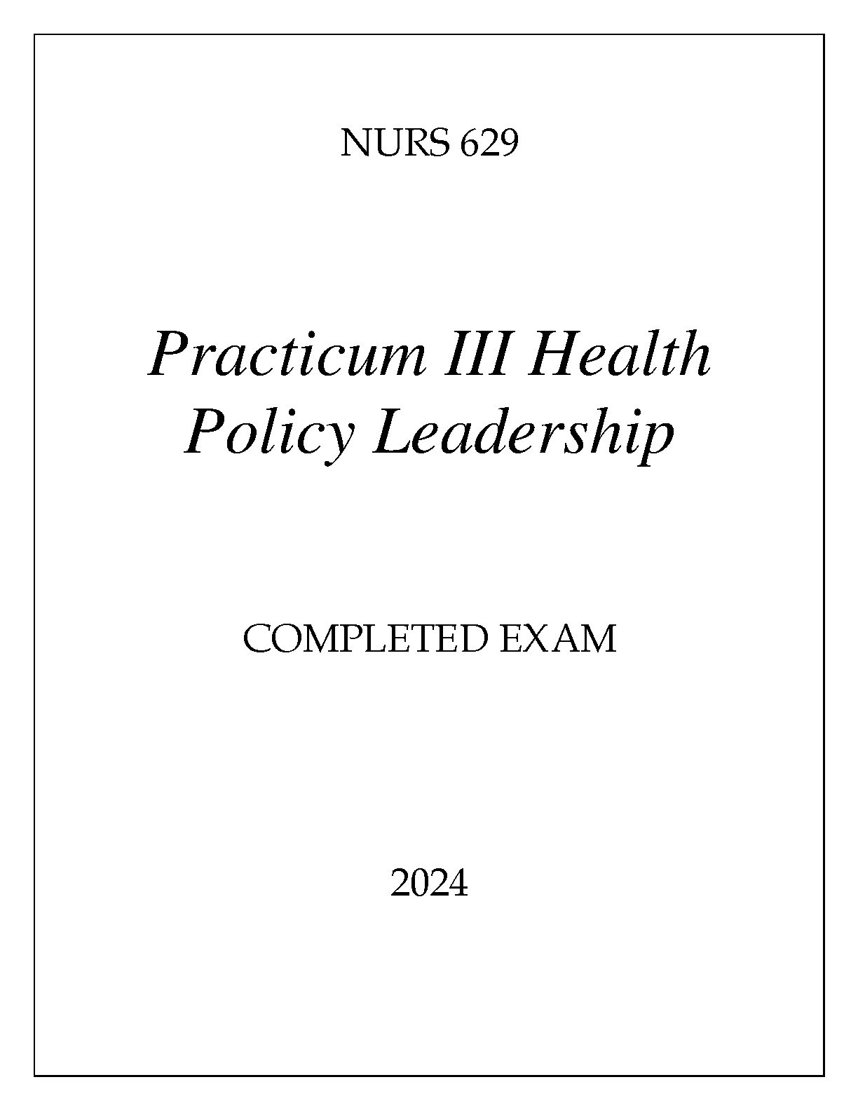 Ace your NURS 629 Practicum III Health Policy Leadership Exam with this comprehensive study guide. This resource contains complete solutions to practice problems, providing in-depth explanations for every question. Enhance your understanding of key concepts and prepare effectively for exam success!