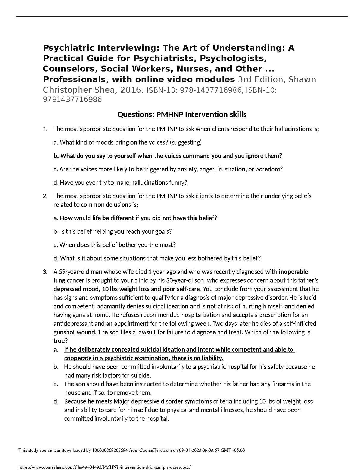 PSYCHOTHERAPY FOR THE ADVANCED PRACTICE PSYCHIATRIC NURSE, SECOND EDITION: A HOW-TO GUIDE FOR EVIDENCE- BASED PRACTICE 2ND EDITION TEST BANK| QUESTIONS AND100% CORRECT ANSWERS| WITH RATIONALE 2023-2024)|ALL CHAPTERS AVAILABLE|A GURANTEED Test bank-Psychotherapy for the Advanced Practice Psychiatric Nurse, Second Edition: A How-To Guide for Evidence- Based Practice 2nd Edition -latest 2022 TEST BANK for Psychotherapy for the Advanced Practice Psychiatric Nurse 3rd Edition A How-To Guide for Evidence-Based Practice by Kathleen Wheeler | Chapters 1-20 Psychotherapy for the Advanced Practice Psychiatric Nurse, Third Edition: A How-To Guide for Evidence- Based Practice 3rd Edition Test Bank ATI Test Bank: Essentials of Psychiatric Mental Health Nursing (3rd Edition 2021) Questions and Answers with Explanations (STUDY MODE) Questions and Answers (latest Update), 100% Correct, Download to Score A HESI MEDSURGE PRACTICE (A Grade), Questions and Answers, All Correct Study Guide, Download to Score A A male client with schizophrenia who is taking fluphenazine decanoate (Prolixin) is being discharged in the morning. A repeat dose of medication is scheduled for 20 days after discharge. The client tells the nurse that he is going on vacation in the Bahamas and will return in 18 days. Which statement by the client indicates a need for health teaching? A 45-year-old male client tells the nurse that he used to believe that he was Jesus Christ, but now he knows he is not. Which response is best for the nurse to make? A female client with depression attends group and states that she sometimes misses her medication appointments because she feels very anxious about riding the bus. Which statement is the nurse's best response? The nurse suspects child abuse when assessing a 3-year-old boy with several small, round burns on his legs and trunk that appear to be the result of cigarette burns. Which parental behavior provides the greatest validation for such interpretation? A young adult female client with a diagnosis of anorexia nervosa wants to help serve dinner trays to other clients on a psychiatric unit. What action should the nurse take? Psychotherapy for the Advanced Practice Psychiatric Nurse, Third Edition: A How-To Guide for Evidence- Based Practice 3rd Edition Test Bank by Wheeler Psychotherapy for the Advanced Practice Psychiatric Nurse Second Edition: A How-To Guide for Evidence Based Practice 2nd Edition Test Bank TEST BANK: ESSENTIALS OF PSYCHIATRIC MENTAL HEALTH NURSING 3RD EDITION BY VARCAROLIS ALL CHAPTERS, QUESTIONS AND ANSWERS WITH RATIONALES (2023-2024 UPLOAD) 100% GUARANTEED Graded A Psychotherapy for the Advanced Practice Psychiatric Nurse, Second Edition: A How-To Guide forEvidenceBased Practice 2nd Edition Test Bank