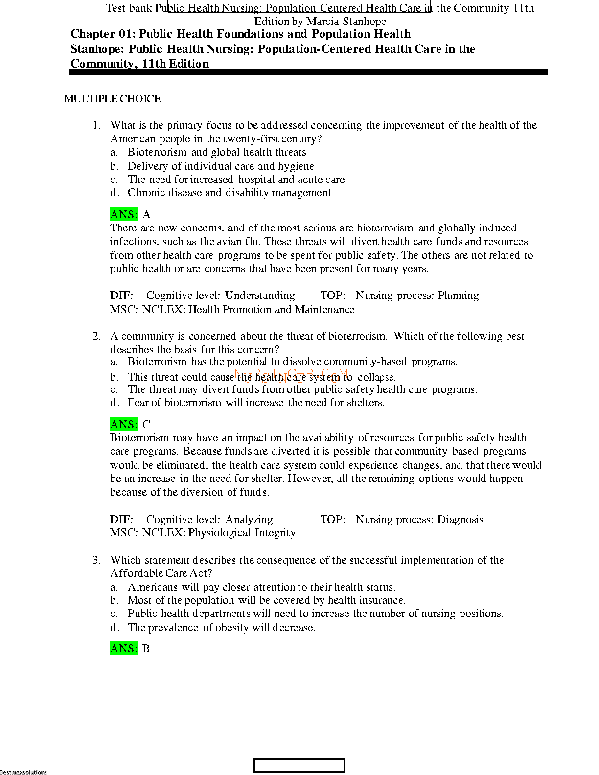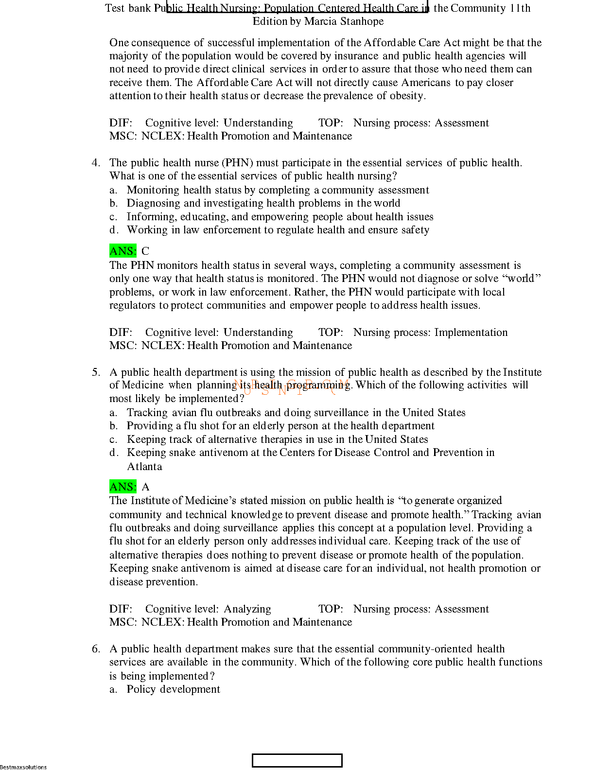 Public Health Nursing: Population Centered Health Care in the Community 11th Edition - Marcia Stanhope and Jeanette Lancaster Test Bank Solutions Manual