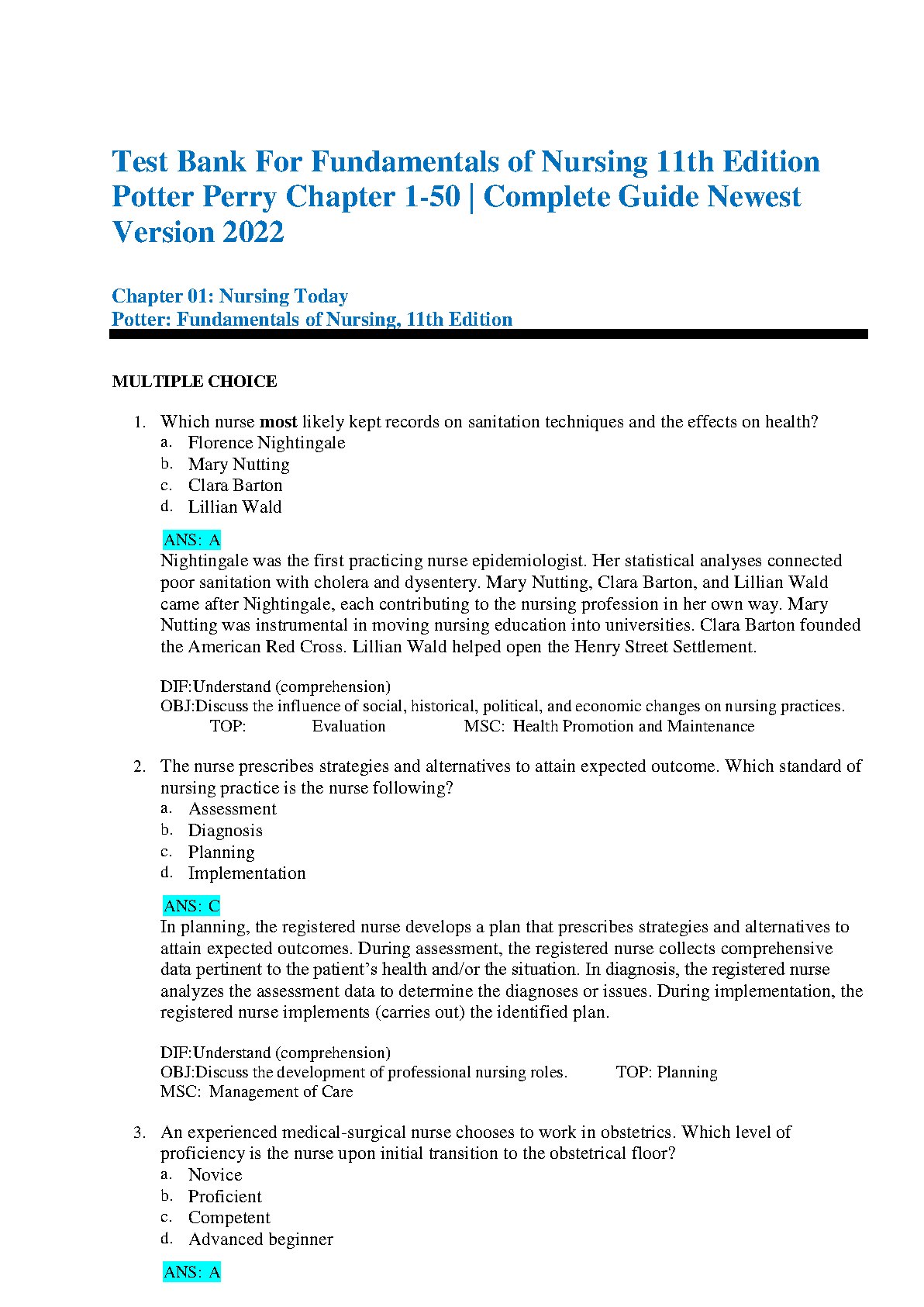 Potter Perry Fundamentals of Nursing 11th Edition Test Bank by Potter Perry, Anne Griffin, Patricia A. Davidson, and Sharon J. Foley - Complete Guide Newest Version 2022 - Latest Edition for 2024/2025 Academic Year