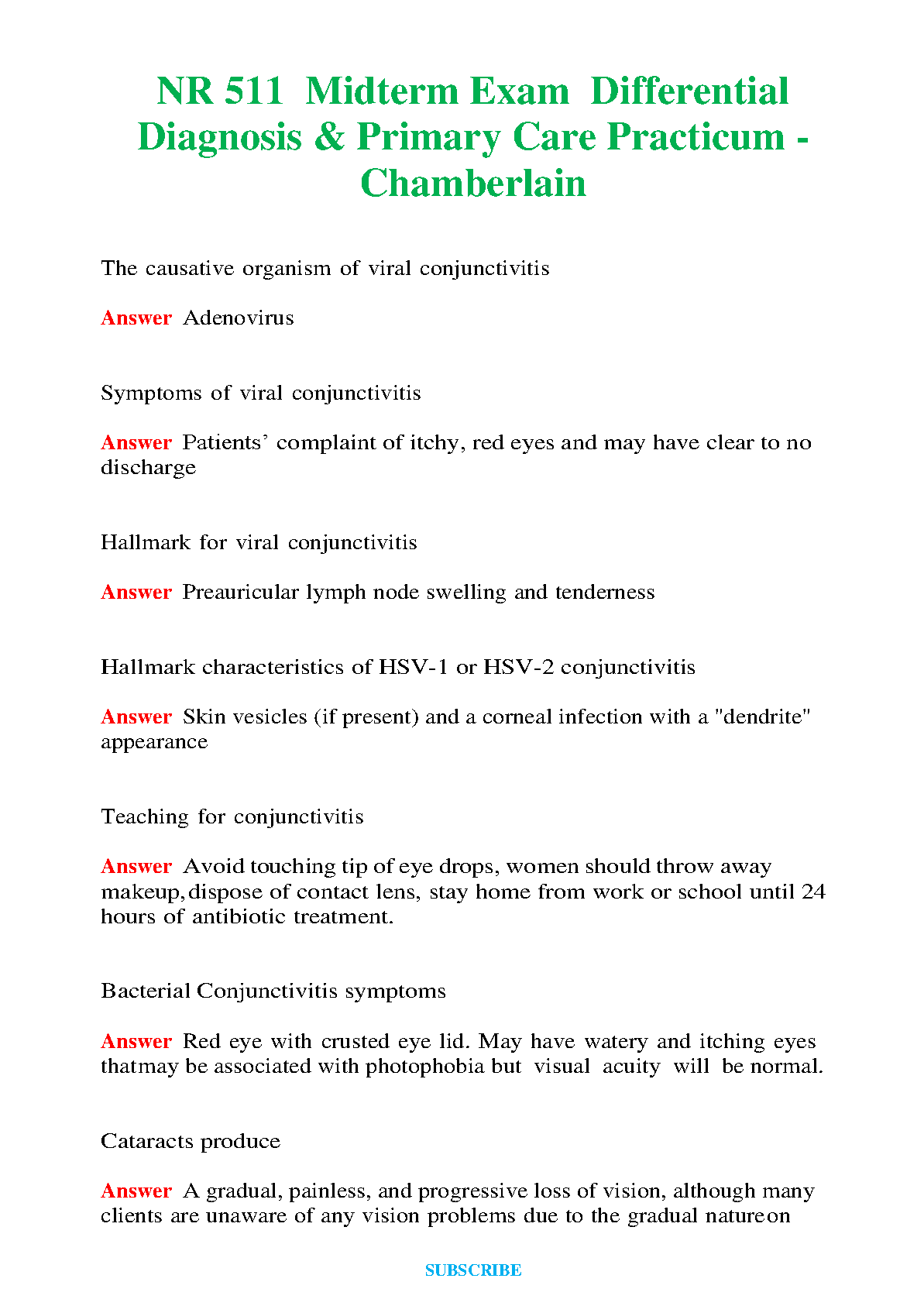 NR 511 Midterm Exam Differential Diagnosis & Primary Care Practicum - Chamberlain - Edition 2024-2025