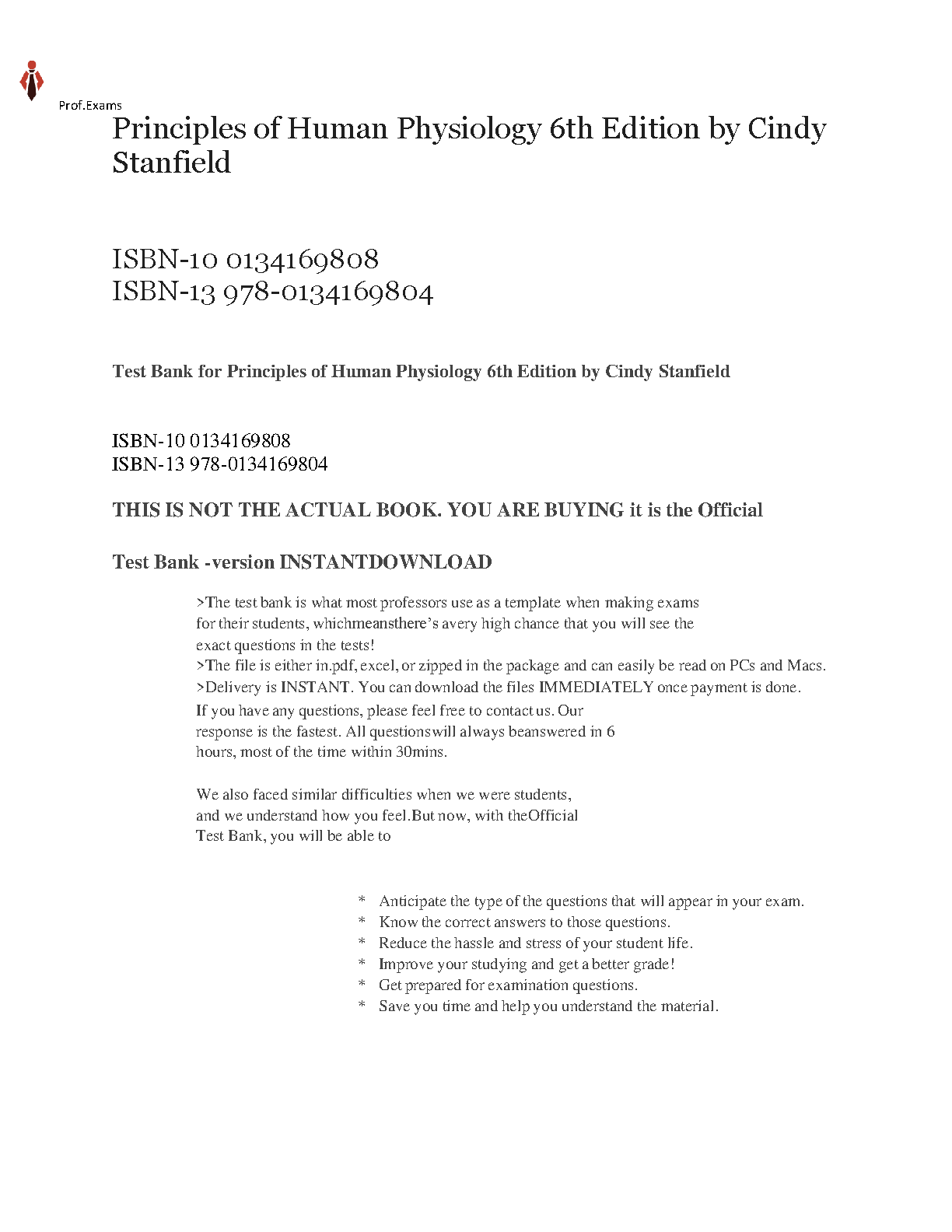 Ace your Human Physiology exams with our comprehensive test bank for Principles of Human Physiology, 6th Edition by Cindy L. Stanfield. This resource is designed to help you thoroughly understand key concepts and practice answering a wide range of questions, ensuring you're fully prepared for success on your first attempt!