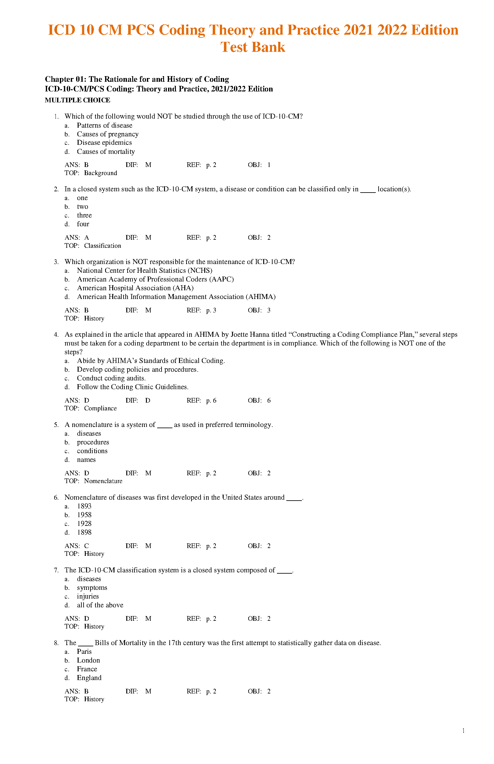 ICD-10-CM PCS Coding: Theory and Practice, 2021/2022 Edition - Test Bank by Barbara J. Kovaleski, Sharon L. Doherty, and Carolyn J. Burch