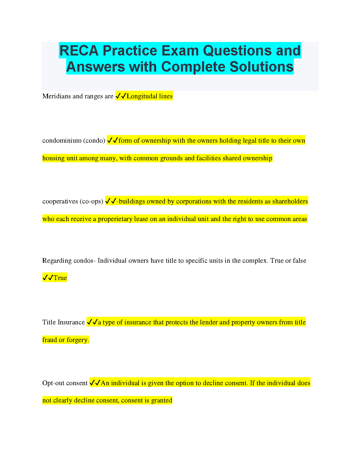 RECA Practice Exam Questions and Answers with Complete Solutions: A Comprehensive Guide to Passing Your Real Estate Exam on the First Try