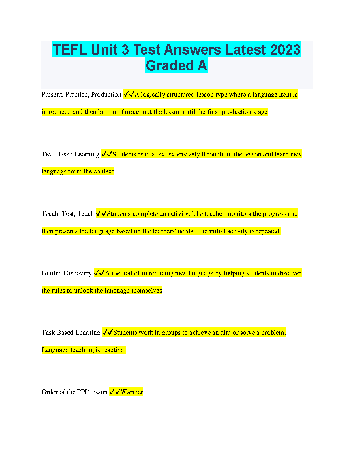 TEFL Unit 3 Test Answers Latest 2023 Graded A - Study Guide for Success