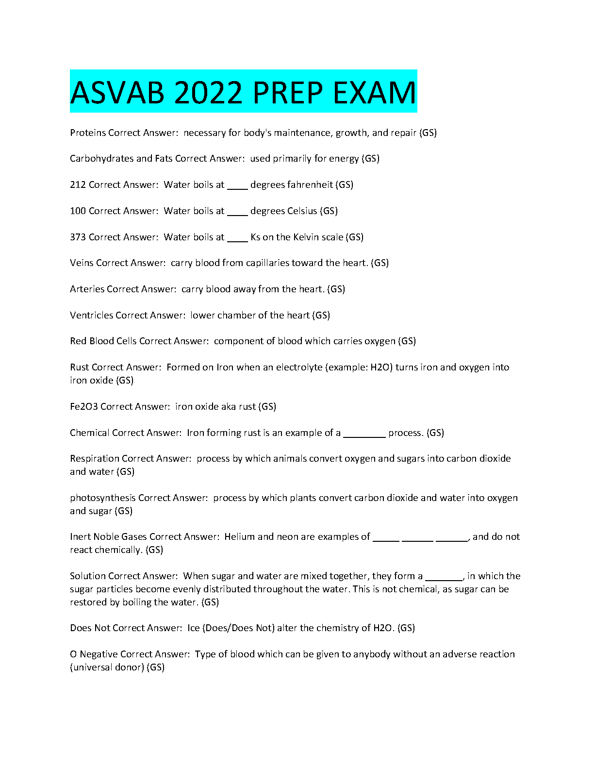 ASVAB practice test 1 Questions And Answers LATEST UPDATE 2023 $18.00 ASVAB 2022/2023 PREP EXAM UPDATE $18.00 ASVAB Practice test BEST RATED SOLUTION 2023 $18.00 ASVAB Practice Test 1 Mathematics Knowledge. Top Exam Questions and Answers, Rated A+ 2023 $18.00 ASVAB: Arithmetic Reasoning Question and Answer 2023 $18.00 ASVAB practice test, Top Exam Question with accurate answers, 100% Accurate, Graded A+ $18.00 General Science ( Asvab test) Answered Summer 2022 LATEST SOLUTION $18.00 ASVAB Top Questions and answers. 100% Accurate, rated A+2023 $18.00 Asvab Mathematics Arithmetic Knowledge WITH VERIFIED ANSWERS 2023 $18.00 ASVAB Section 7: General Science QUESTIONS AND ANSWERS 2023 $18.00 ASVAB Practice Test SECTION 1: General Science LATEST SOLUTION GRADED A+ $18.00 PICAT/ASVAB TEST QUESTIONS (840 Questions – (All versions)) with 100% Correct Answers) Q-Bank $18.00 ASVAB-NAVY EXAM PRACTICE QUESTIONS AND CORRECT ANSWERS 2023 $18.00 ASVAB Electronics Questions and Answers 2023/2024 $18.00 ASVAB BSEP words 2022/2023 UPDATED $18.00 ASVAB Word Knowledge Test 2022/2023 with COMPLETE SOLUTION $18.00 ASVAB: Arithmetic Reasoning Test VERIFIED ANSWERS 2023 $18.00 ASVAB Pool Exam Top Questions & Answers, 100% Accurate, Graded A+ $18.00 ASVAB practice test Questions And Answers RATED A+ $18.00 Full ASVAB Practice Test 2022/2023 with COMPLETE SOLUTIONS $18.00 ASVAB practice test Questions and answers, 100% Approved. Top Questions WITH VERIFIED SOLUTIONS $18.00 ASVAB 2023 TEST BANK LATEST SOLUTION $18.00 ASVAB General Science BEST RATED SOLUTION RATED A+ $18.00 ASVAB Study Guide 2022/2023 UPDATED $18.00 General Science (ASVAB) QUESTIONS AND CORRECT ANSWERS 2023 $18.00 ASVAB Word Knowledge Practice Test Test Result RATED A+ $18.00 ASVAB Paragraph Comprehension Test Test Result SCORED 100% $18.00 Real Asvab test!!! Questions with 100% Accurate answers. Graded A+. Latest 2022/2023 $18.00 ASVAB Section 8: Paragraph comprehension BEST SOLUTION 2023 $18.00 ASVAB Math (2022/2023) LATEST UPDATE RATED A+ $18.00 SOLVED-Elaborated ASVAB GENERAL SCIENCE SOLUTION GUIDE 2023/2024 $18.00 ASVAB Science Pool Questions and answers, 100% Accurate, Graded A $18.00 Picat - ASVAB with complete Solution LATEST UPDATE 2023 $18.00 ASVAB PICAT VERIFICATION TEST WITH VERIFIED ANSWERS 2023 $18.00 Arithmetic Reasoning ASVAB PRACTICE Questions And Answers RATED A+ $18.00 ASVAB Questions & Answers, 100% Accurate, Exam predictor. Verified SOLUTION 2023 $18.00 Asvab Top Notch Exam Prep Review. 100% Accurate. Approved mastery 2023 $18.00 ASVAB - Practice math problems WITH CORRECT ANSWERS 2023 $18.00 ASVAB Section 9 : Assembling Objects BEST RATED SOLUTION 2023 $18.00 Practice ASVAB Test Assembling Objects Test Result LATEST SOLUTION $18.00 ASVAB Section 6 : Mathematics Knowledge UPDATED SOLUTION 2023 $18.00 (ASVAB) Armed Services Vocational Aptitude Battery - Study Guide 2022/2023 (MCQs, Answers Provided) A+ GUIDE $18.00 ASVAB Section 1 : Word Knowledge BRAND NEW SOLUTION 2023 $18.00 Asvab Arithmetic Reasoning Actual Practice Test WITH CORRECT & VERIFIED ANSWERS $18.00 ASVAB Auto and Shop information Study Questions with COMPLETE SOLUTION BRAND NEW!! $18.00 Picat Asvab Review 2022 /2023 UPDATED VERSION $18.00 ASVAB Test Prep UPDATED EDITION FOR 2023/2024 $18.00