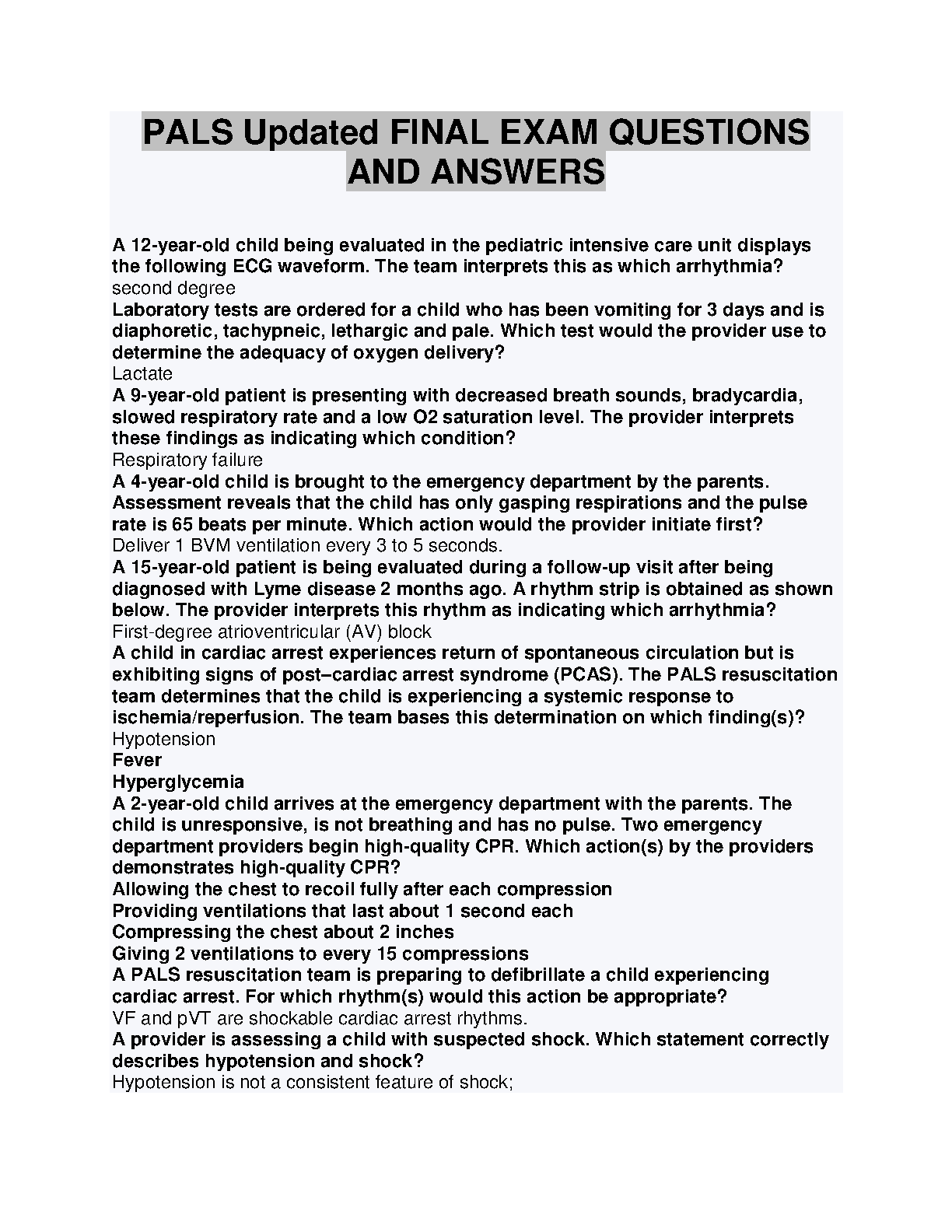 PALS Updated Final Exam Questions and Answers 2024/2025 - The Ultimate Guide to Passing PALS Exam on Your First Attempt