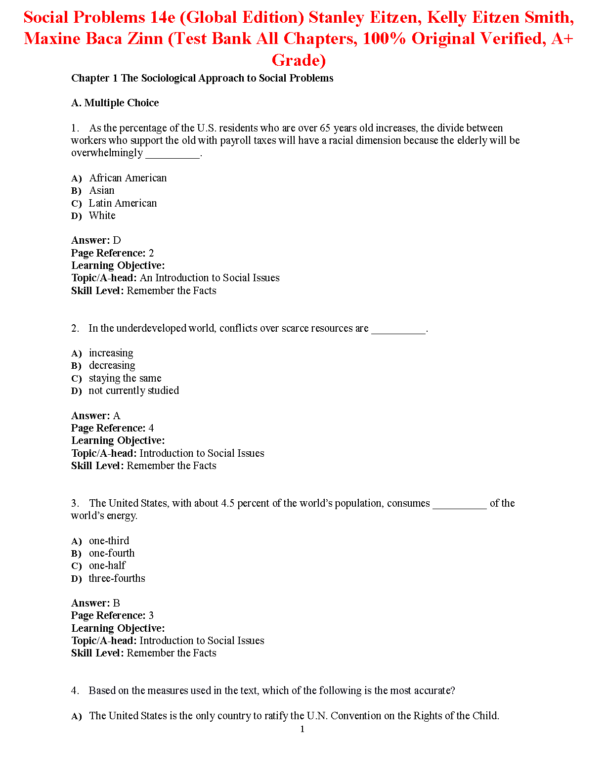 Social Problems 14e (Global Edition) Stanley Eitzen, Kelly Eitzen Smith, Maxine Baca Zinn (Test Bank All Chapters, 100% Original Verified, A+ Grade)
