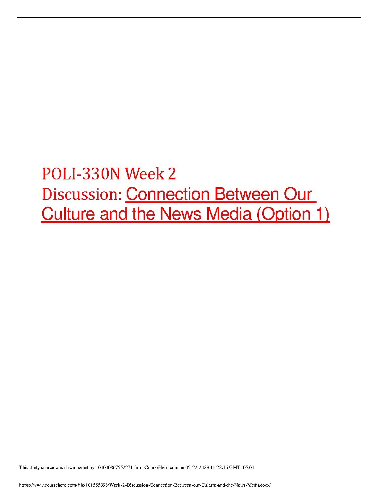 POLI-330N Week 2 Discussion: Connection Between Our Culture and the News Media (Option 1) for 2024/2025 Academic Year - Ace Your Exams on the First Attempt!