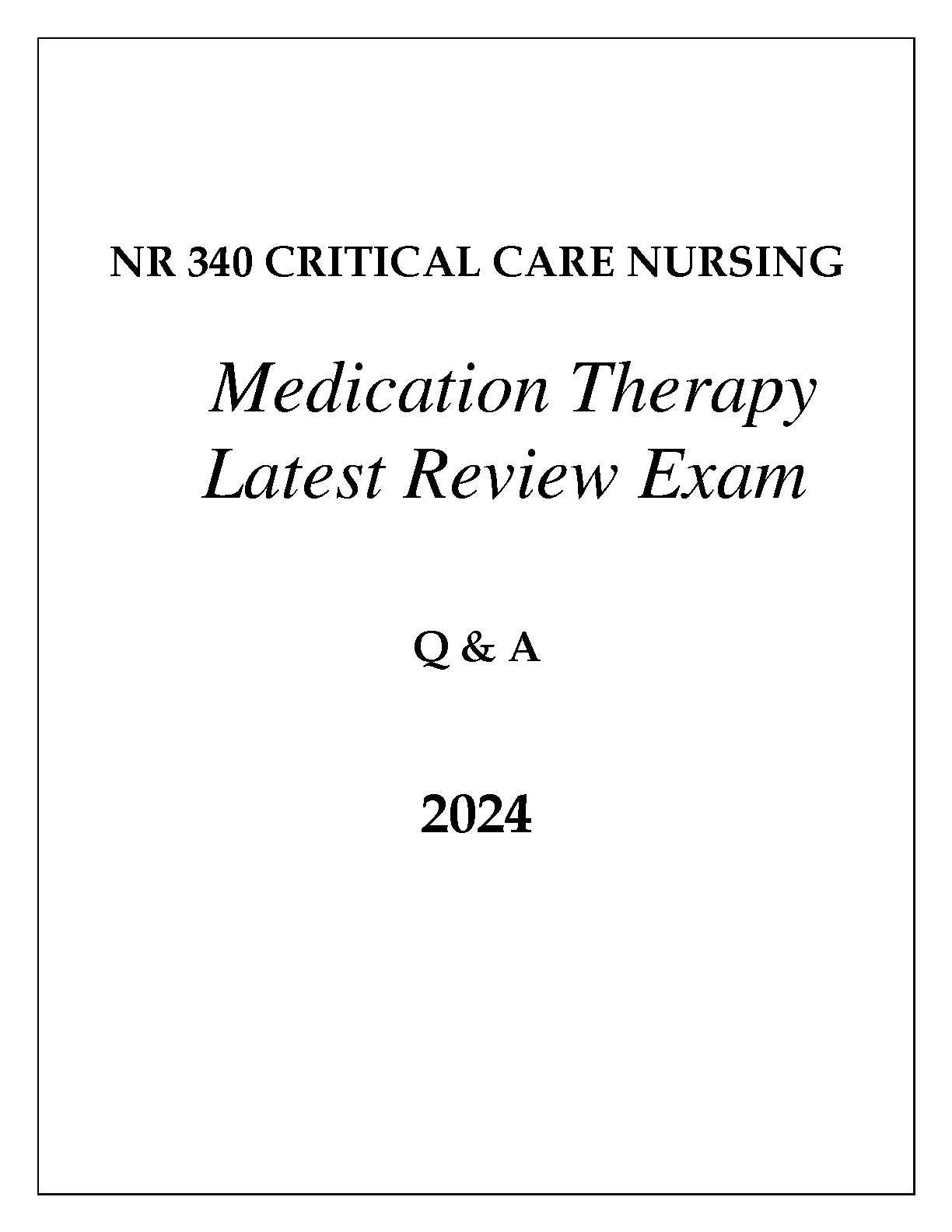 NR 340 Critical Care Nursing - Medication Therapy Latest Review Exam Q&A 2024 Ace your NR 340 Critical Care Nursing - Medication Therapy exam with this comprehensive Q&A review guide. Prepare for success and avoid resits with this latest edition, covering