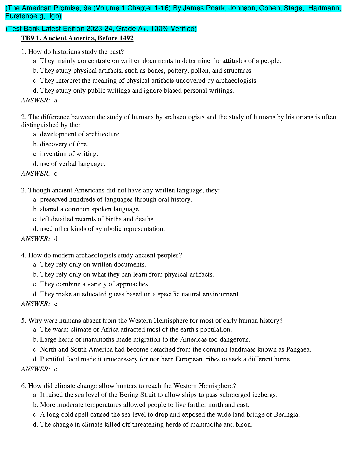 The American Promise, 9e (Volume 1 Chapter 1-16) by James Roark, Johnson, Cohen, Stage, Hartmann, Furstenberg, Igoj - Latest Edition 2023-24, Grade A+, 100% Verified