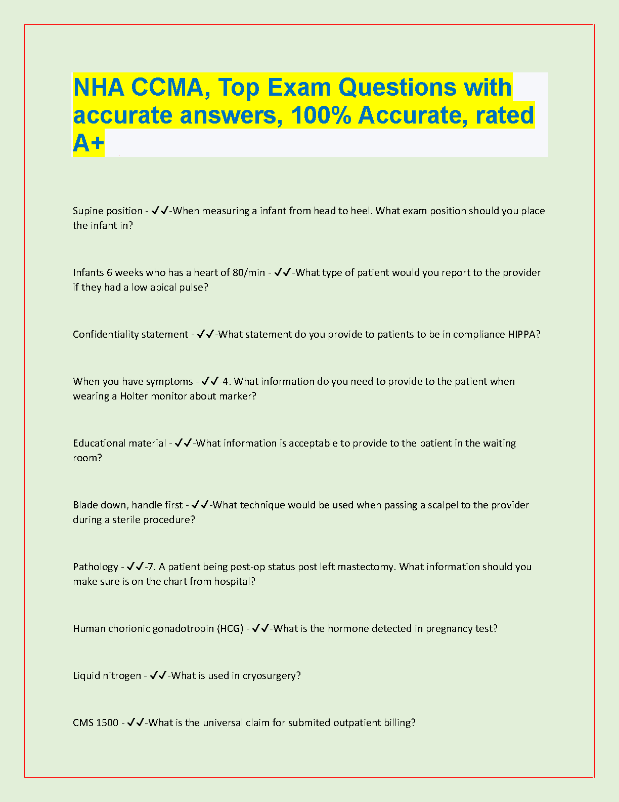 NHA CCMA Exam Prep: Top Exam Questions with Accurate Answers, 100% Accurate, Rated A+
