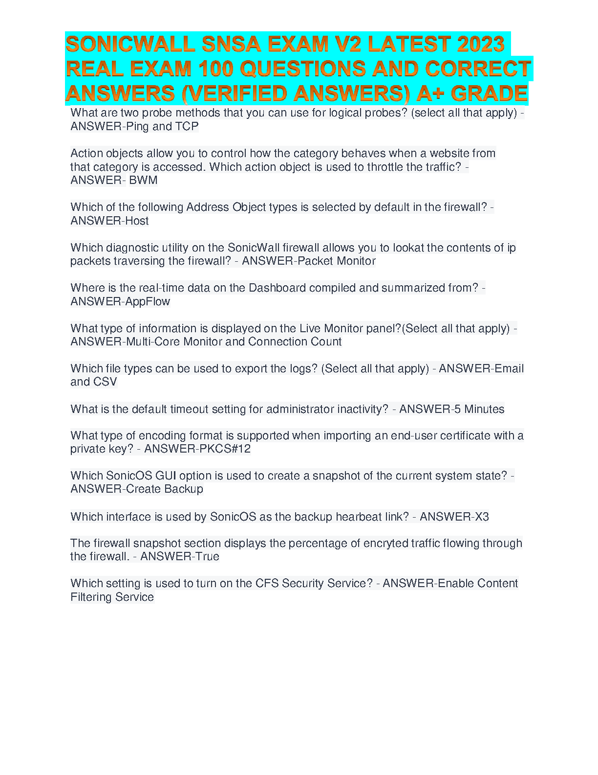 SonicWall SSNA Exam V2 Latest 2023 Real Exam 100 Questions and Correct Answers (Verified Answers) A+ Grade