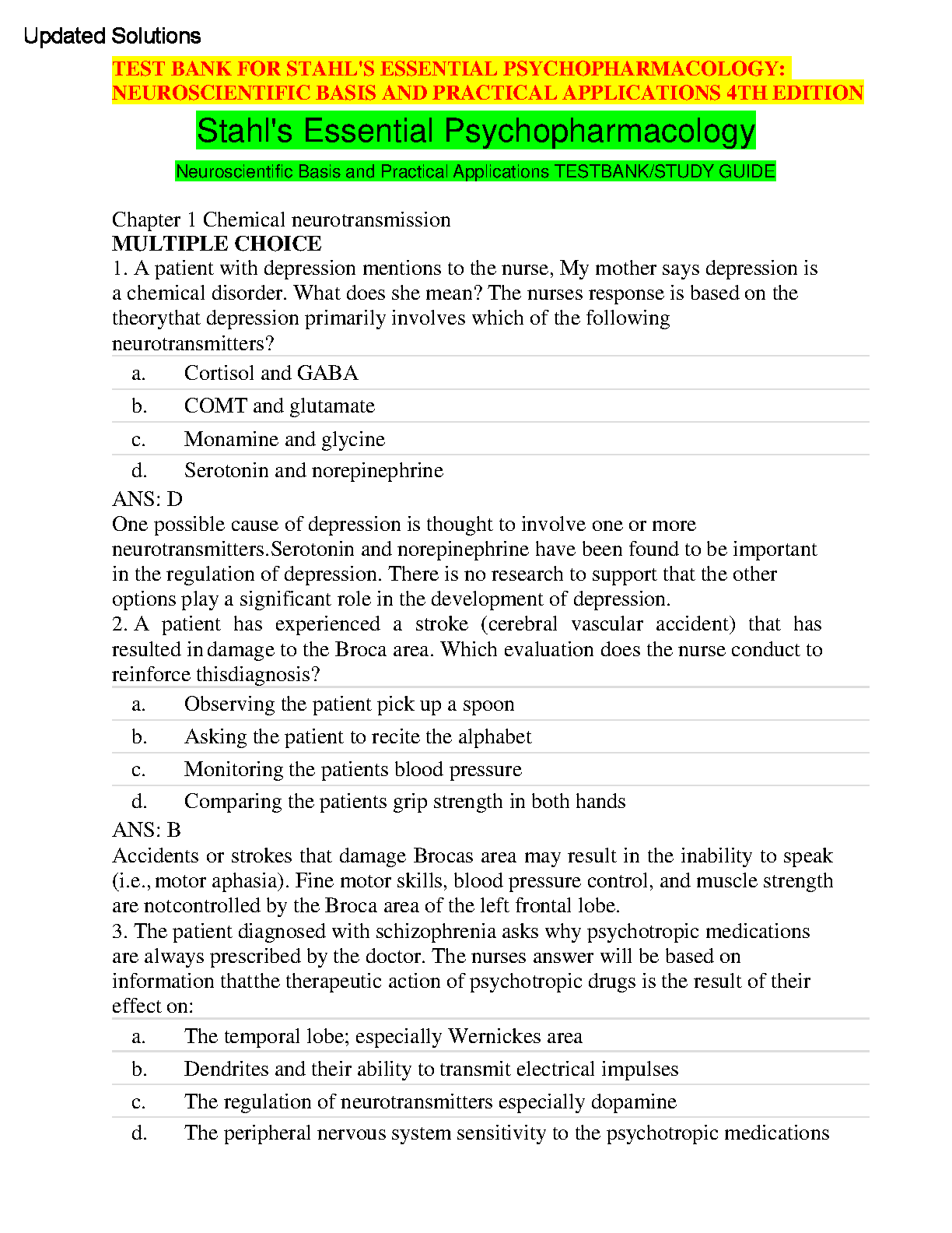 Get ready to ace your Psychopharmacology exams with this comprehensive test bank designed to help you master the essential concepts and clinical applications of the 4th edition of Stahl's Essential Psychopharmacology. This resource features a wide range of multiple-choice questions covering the neurobiological basis of psychopharmacology and the practical aspects of drug therapy.
