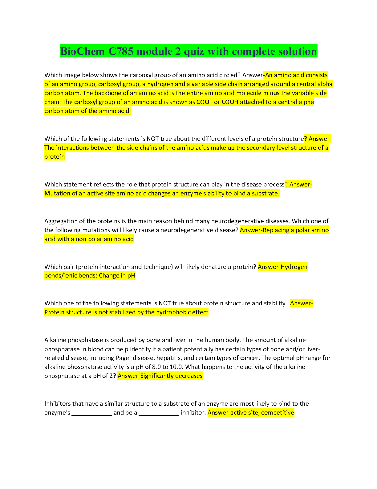 Ace your Biochemistry C785 Module 2 quiz on the first attempt with this comprehensive solution guide! This resource covers essential topics like protein structure, function, and interactions, and provides clear explanations for each concept. Ensure exam success and avoid resits with this invaluable study aid.