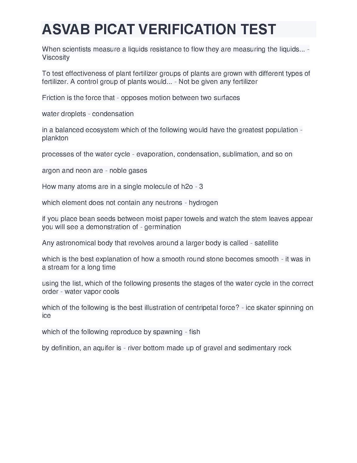 ASVAB PICAT VERIFICATION TEST WITH VERIFIED ANSWERS 2023