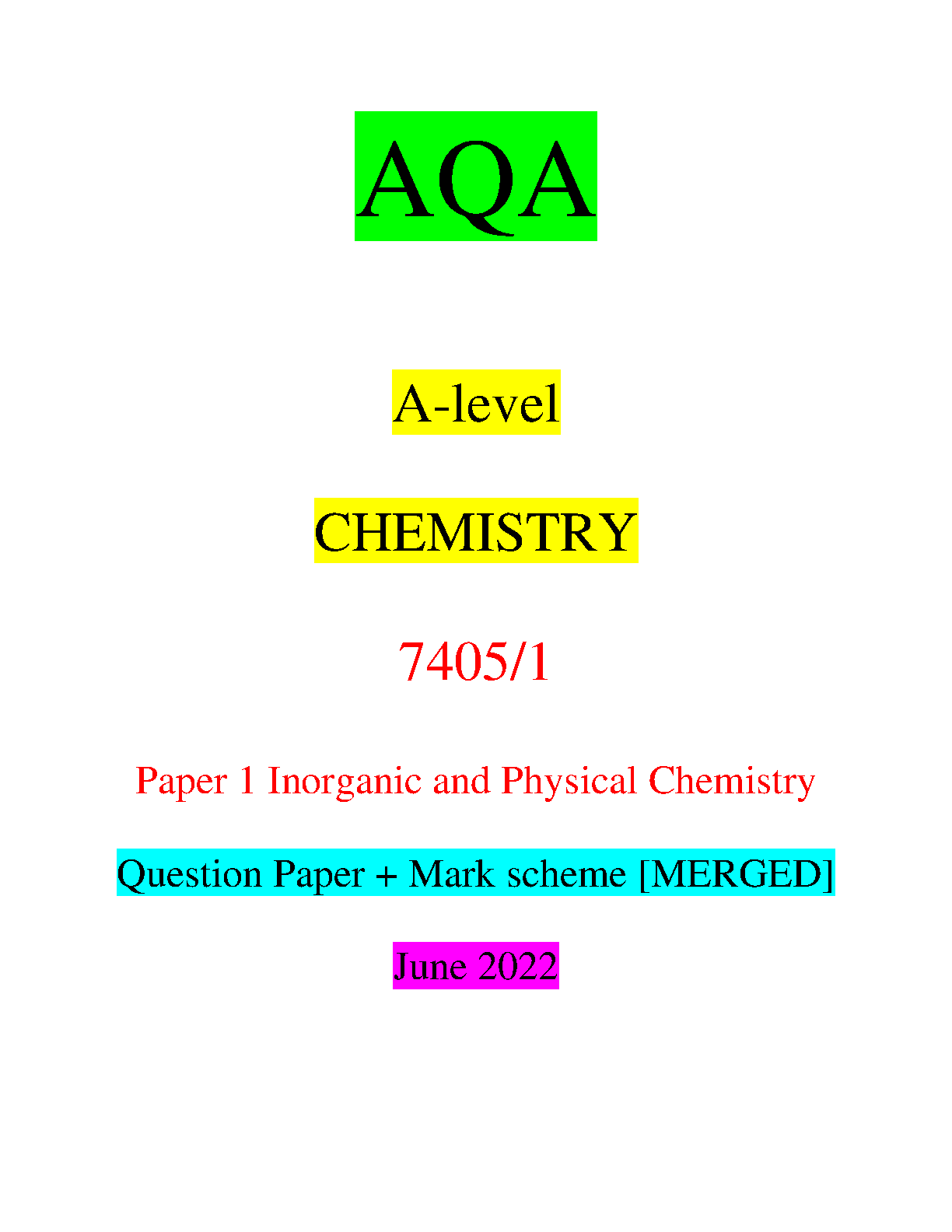 AQA A-Level Chemistry 7405/1 Paper 1 Inorganic and Physical Chemistry June 2022 Question Paper + Mark Scheme [MERGED] is a valuable resource for students preparing for their A-Level Chemistry exams. It includes the full exam paper and mark scheme, allowing students to practice answering questions and assess their understanding of the content.