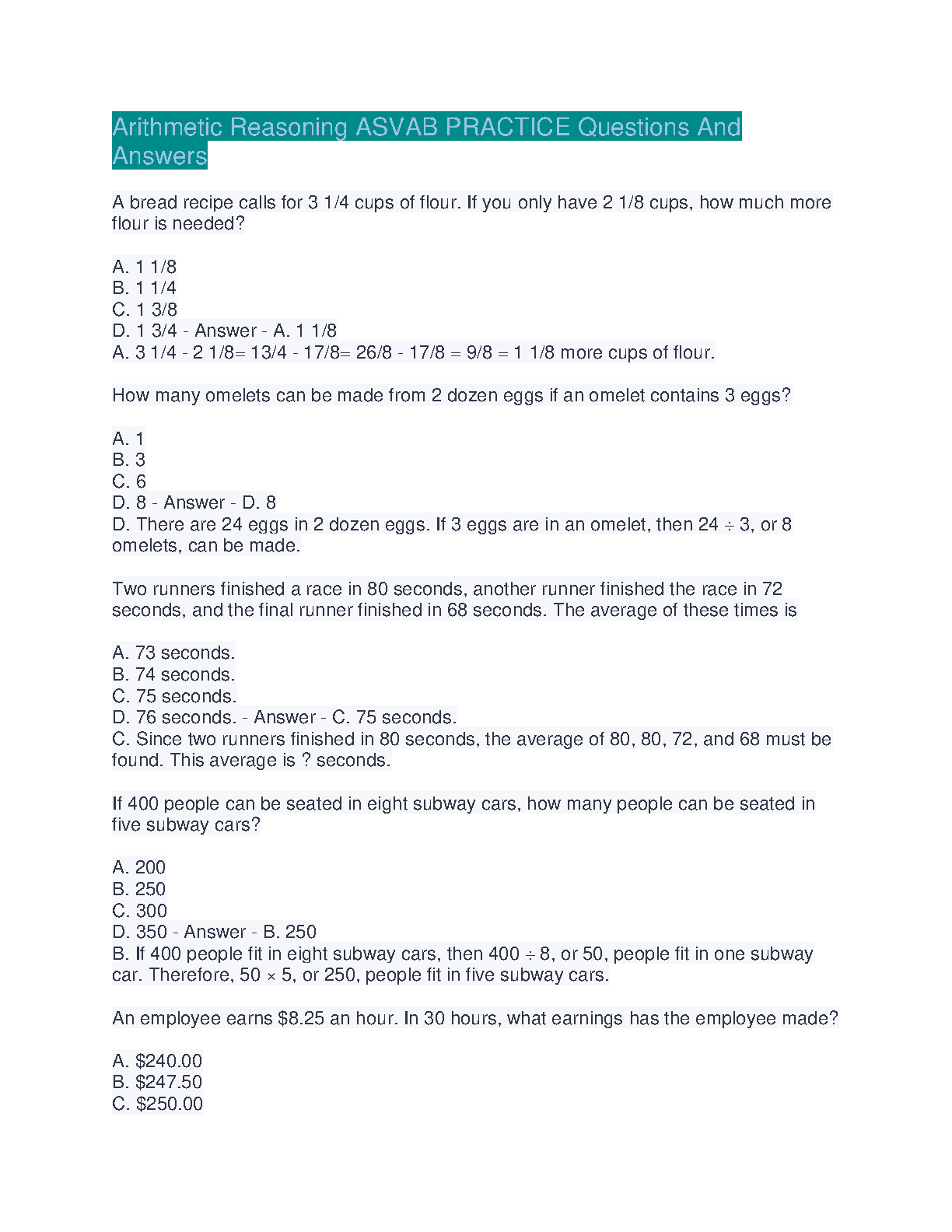Arithmetic Reasoning ASVAB PRACTICE Questions And Answers RATED A+