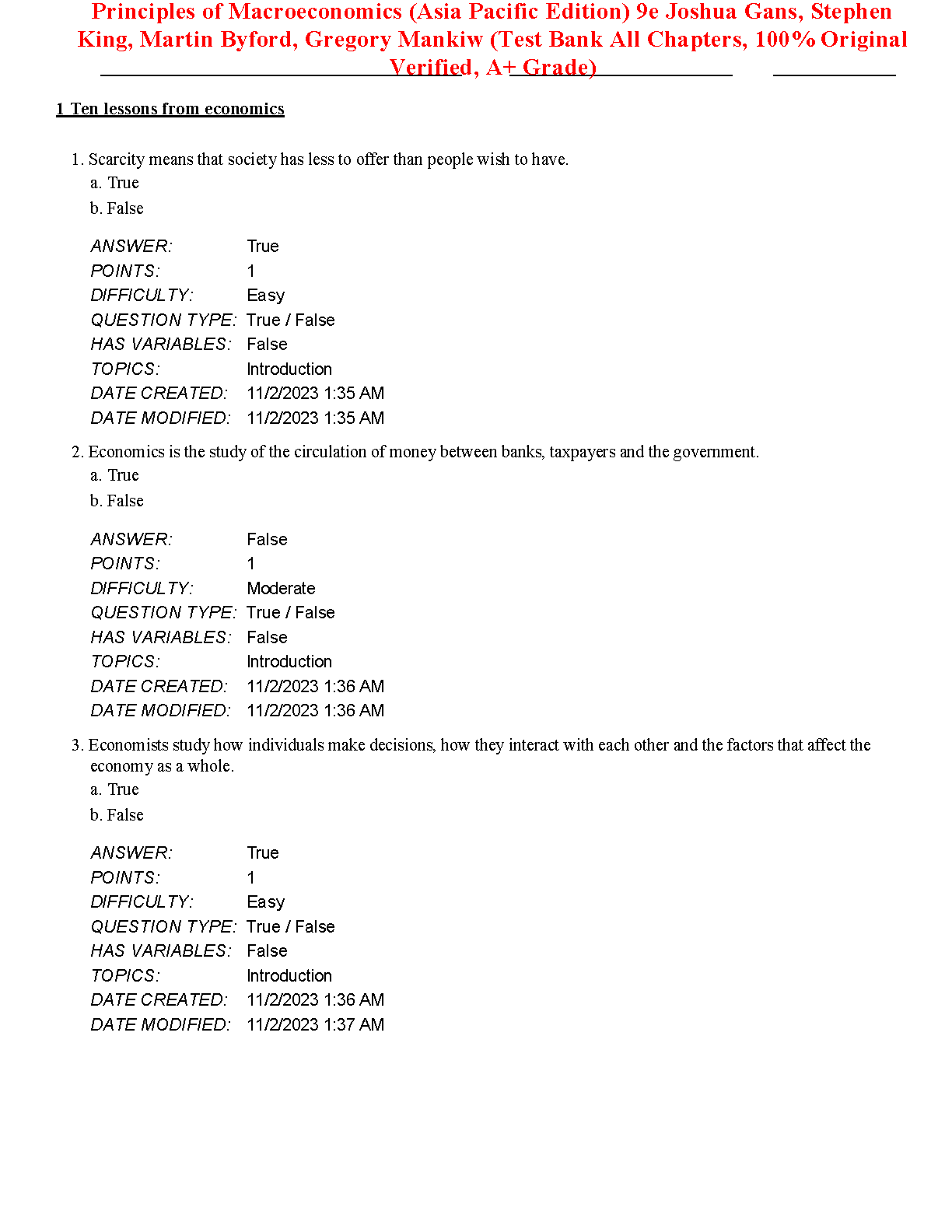 Principles of Macroeconomics (Asia Pacific Edition) 9e Joshua Gans, Stephen King, Martin Byford, Gregory Mankiw (Test Bank All Chapters, 100% Original Verified, A+ Grade)