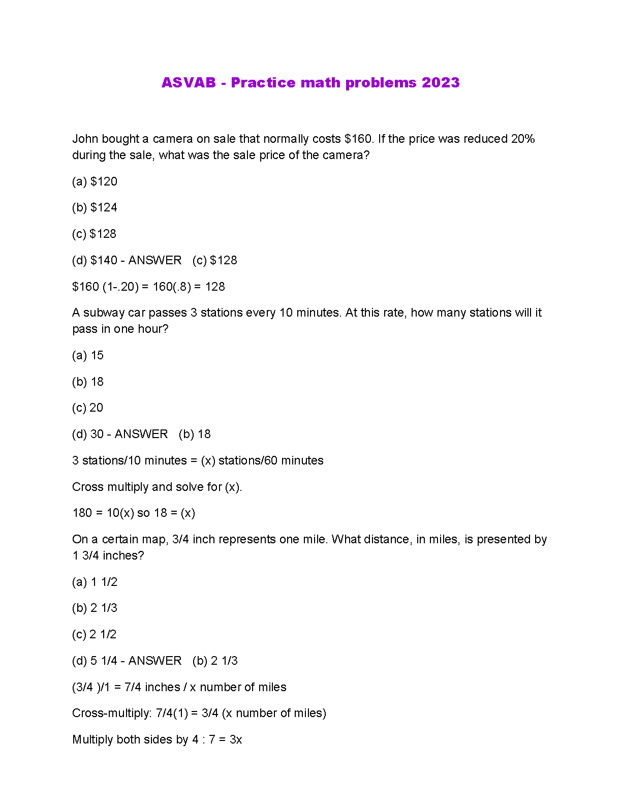 ASVAB - Practice math problems WITH CORRECT ANSWERS 2023