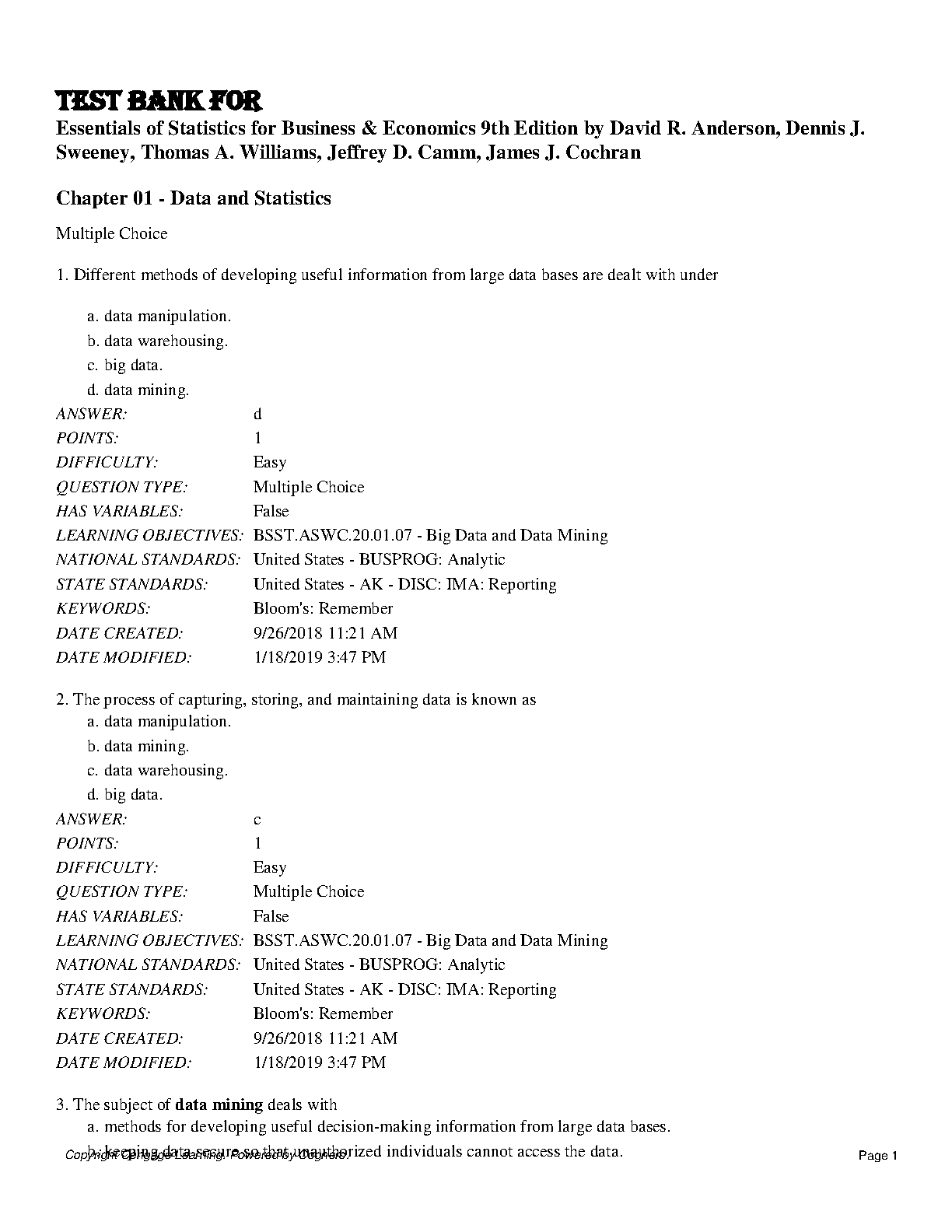 Test Bank For Essentials of Statistics for Business & Economics 9th Edition by David R. Anderson, Dennis J. Sweeney, Thomas A. Williams, Jeffrey D. Camm, James J. Cochran