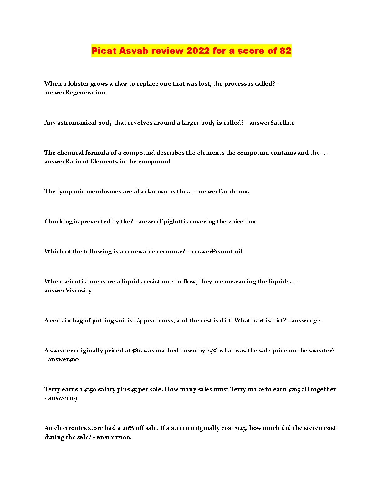 ASVAB practice test 1 Questions And Answers LATEST UPDATE 2023 $18.00 ASVAB 2022/2023 PREP EXAM UPDATE $18.00 ASVAB Practice test BEST RATED SOLUTION 2023 $18.00 ASVAB Practice Test 1 Mathematics Knowledge. Top Exam Questions and Answers, Rated A+ 2023 $18.00 ASVAB: Arithmetic Reasoning Question and Answer 2023 $18.00 ASVAB practice test, Top Exam Question with accurate answers, 100% Accurate, Graded A+ $18.00 General Science ( Asvab test) Answered Summer 2022 LATEST SOLUTION $18.00 ASVAB Top Questions and answers. 100% Accurate, rated A+2023 $18.00 Asvab Mathematics Arithmetic Knowledge WITH VERIFIED ANSWERS 2023 $18.00 ASVAB Section 7: General Science QUESTIONS AND ANSWERS 2023 $18.00 ASVAB Practice Test SECTION 1: General Science LATEST SOLUTION GRADED A+ $18.00 PICAT/ASVAB TEST QUESTIONS (840 Questions – (All versions)) with 100% Correct Answers) Q-Bank $18.00 ASVAB-NAVY EXAM PRACTICE QUESTIONS AND CORRECT ANSWERS 2023 $18.00 ASVAB Electronics Questions and Answers 2023/2024 $18.00 ASVAB BSEP words 2022/2023 UPDATED $18.00 ASVAB Word Knowledge Test 2022/2023 with COMPLETE SOLUTION $18.00 ASVAB: Arithmetic Reasoning Test VERIFIED ANSWERS 2023 $18.00 ASVAB Pool Exam Top Questions & Answers, 100% Accurate, Graded A+ $18.00 ASVAB practice test Questions And Answers RATED A+ $18.00 Full ASVAB Practice Test 2022/2023 with COMPLETE SOLUTIONS $18.00 ASVAB practice test Questions and answers, 100% Approved. Top Questions WITH VERIFIED SOLUTIONS $18.00 ASVAB 2023 TEST BANK LATEST SOLUTION $18.00 ASVAB General Science BEST RATED SOLUTION RATED A+ $18.00 ASVAB Study Guide 2022/2023 UPDATED $18.00 General Science (ASVAB) QUESTIONS AND CORRECT ANSWERS 2023 $18.00 ASVAB Word Knowledge Practice Test Test Result RATED A+ $18.00 ASVAB Paragraph Comprehension Test Test Result SCORED 100% $18.00 Real Asvab test!!! Questions with 100% Accurate answers. Graded A+. Latest 2022/2023 $18.00 ASVAB Section 8: Paragraph comprehension BEST SOLUTION 2023 $18.00 ASVAB Math (2022/2023) LATEST UPDATE RATED A+ $18.00 SOLVED-Elaborated ASVAB GENERAL SCIENCE SOLUTION GUIDE 2023/2024 $18.00 ASVAB Science Pool Questions and answers, 100% Accurate, Graded A $18.00 Picat - ASVAB with complete Solution LATEST UPDATE 2023 $18.00 ASVAB PICAT VERIFICATION TEST WITH VERIFIED ANSWERS 2023 $18.00 Arithmetic Reasoning ASVAB PRACTICE Questions And Answers RATED A+ $18.00 ASVAB Questions & Answers, 100% Accurate, Exam predictor. Verified SOLUTION 2023 $18.00 Asvab Top Notch Exam Prep Review. 100% Accurate. Approved mastery 2023 $18.00 ASVAB - Practice math problems WITH CORRECT ANSWERS 2023 $18.00 ASVAB Section 9 : Assembling Objects BEST RATED SOLUTION 2023 $18.00 Practice ASVAB Test Assembling Objects Test Result LATEST SOLUTION $18.00 ASVAB Section 6 : Mathematics Knowledge UPDATED SOLUTION 2023 $18.00 (ASVAB) Armed Services Vocational Aptitude Battery - Study Guide 2022/2023 (MCQs, Answers Provided) A+ GUIDE $18.00 ASVAB Section 1 : Word Knowledge BRAND NEW SOLUTION 2023 $18.00 Asvab Arithmetic Reasoning Actual Practice Test WITH CORRECT & VERIFIED ANSWERS $18.00 ASVAB Auto and Shop information Study Questions with COMPLETE SOLUTION BRAND NEW!! $18.00 Picat Asvab Review 2022 /2023 UPDATED VERSION $18.00 ASVAB Test Prep UPDATED EDITION FOR 2023/2024 $18.00