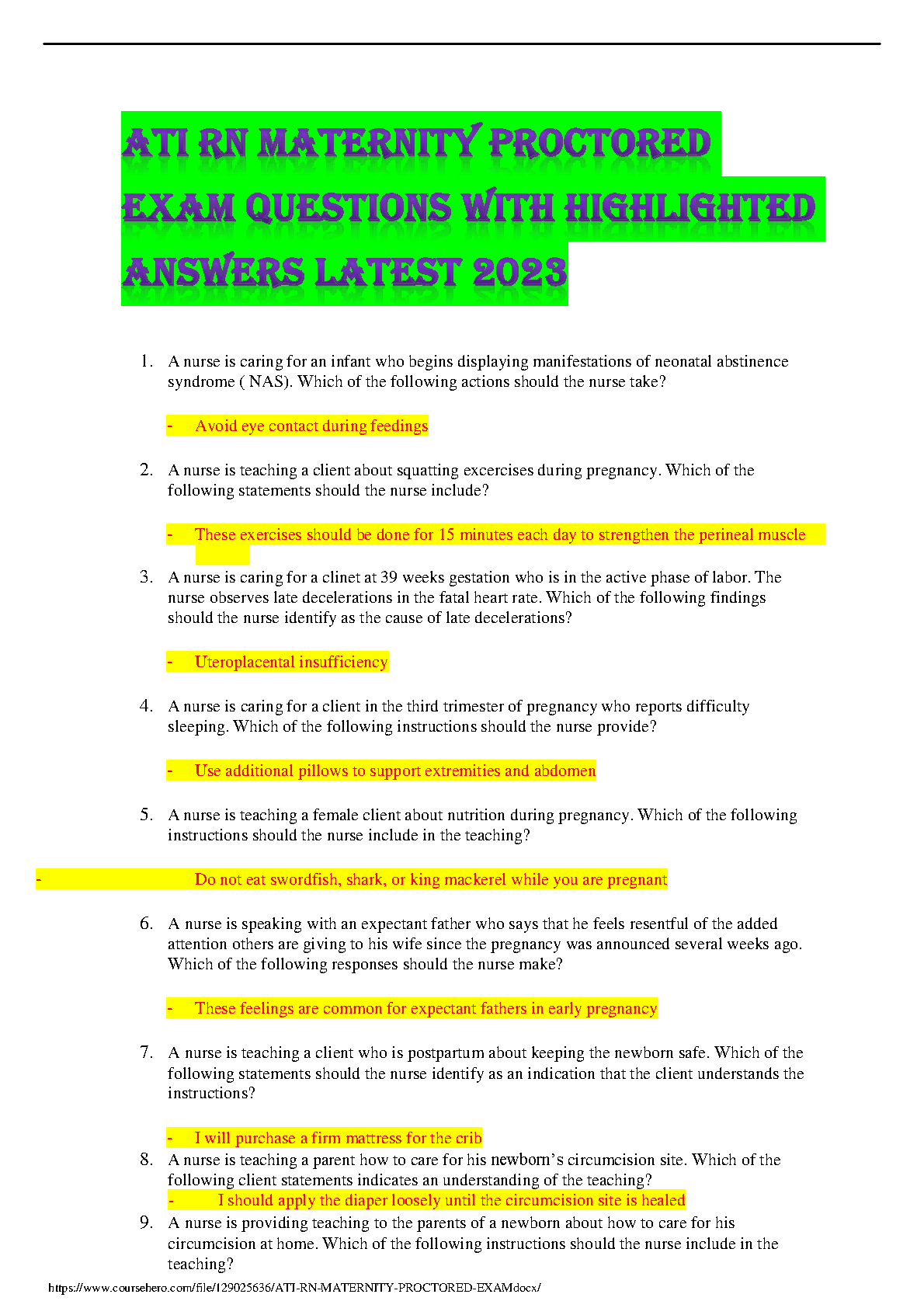 ATI RN Maternity Proctored Exam Questions With Highlighted Answers Latest 2023/2024 Edition by HESI, NCLEX, ATI, NBRC, AHIP, Wonderlic, Prophecy, and More