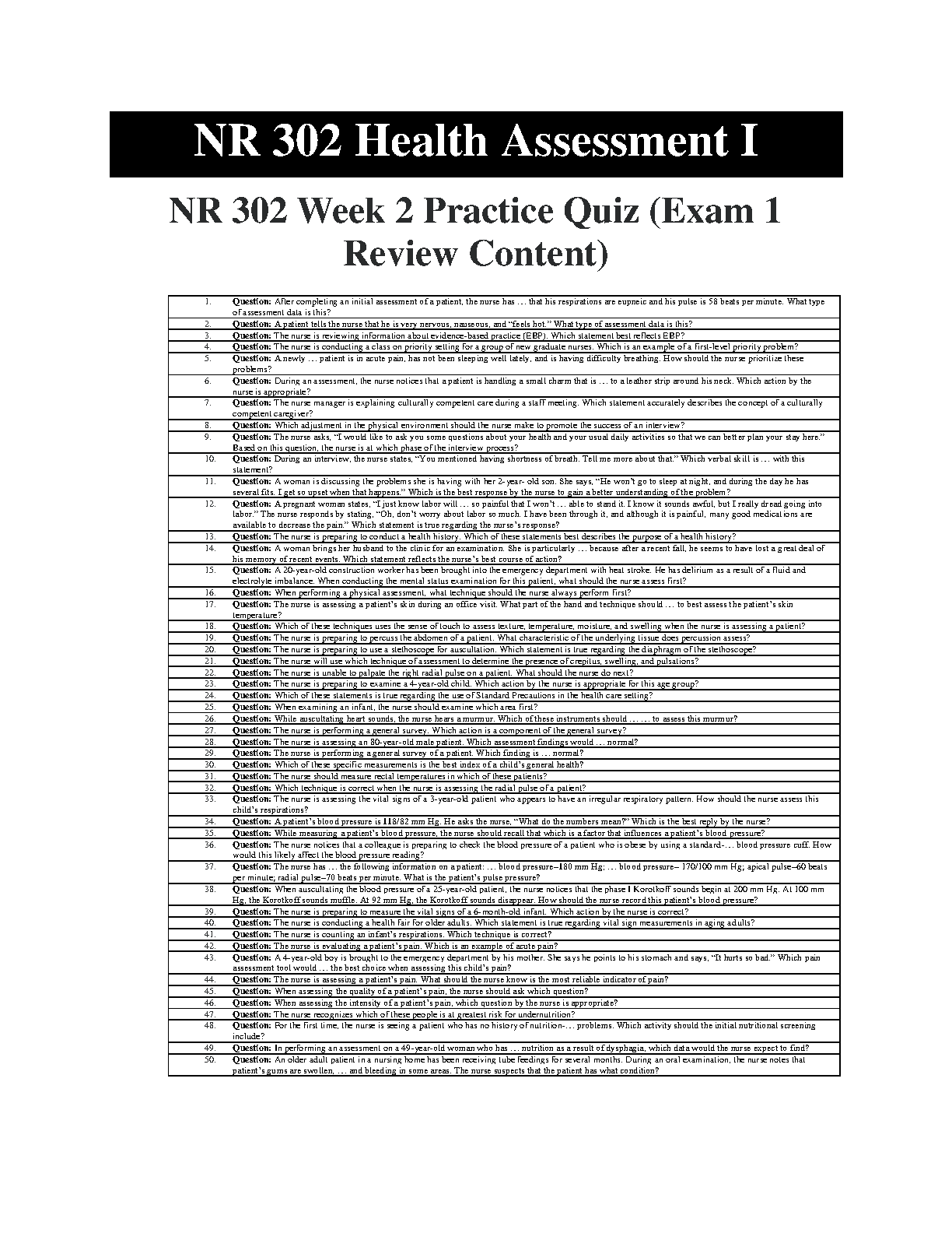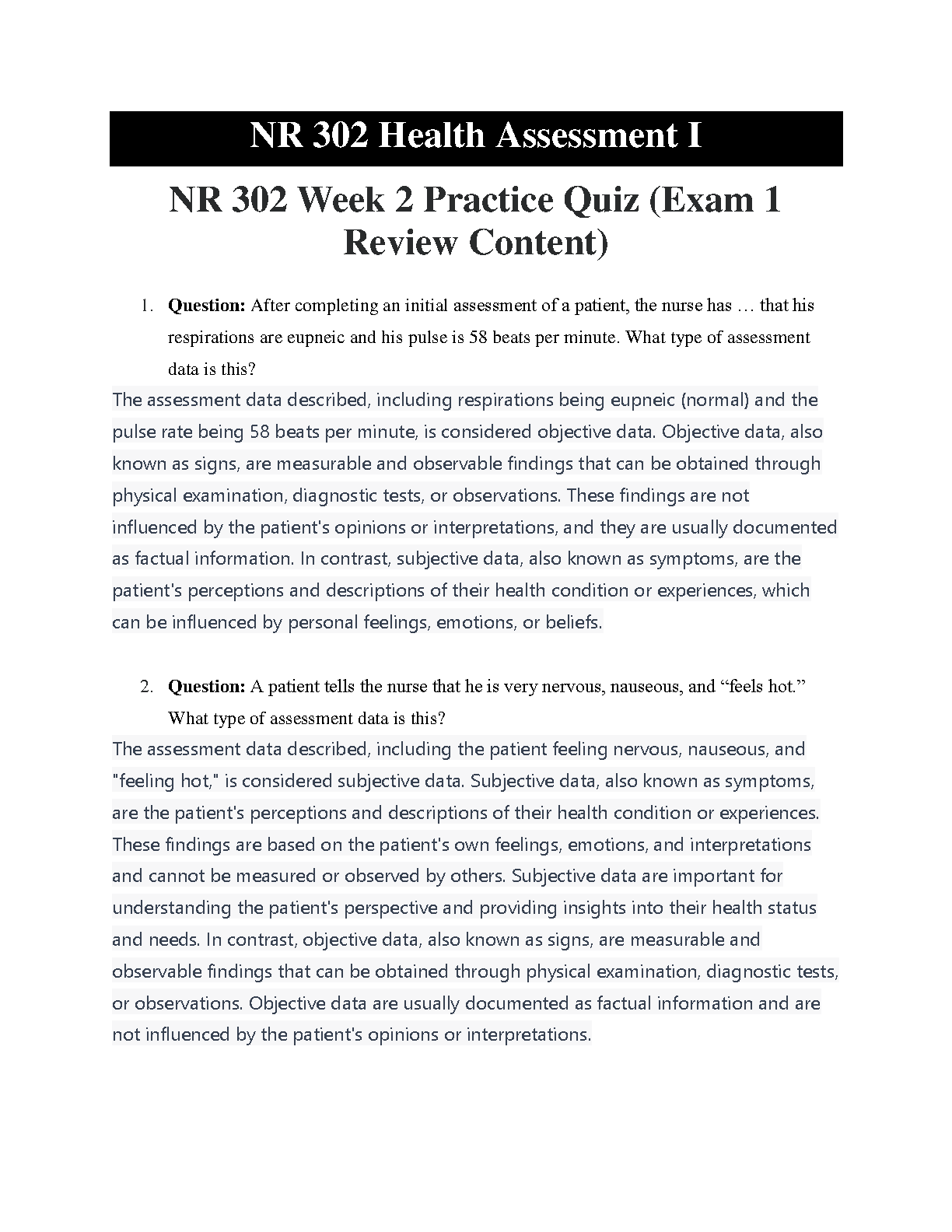 NR 302 Health Assessment I Week 2 Practice Quiz (Exam 1 Review Content) by Unknown Author (2024/2025 Edition) - Ace Your Exams on the First Attempt!
