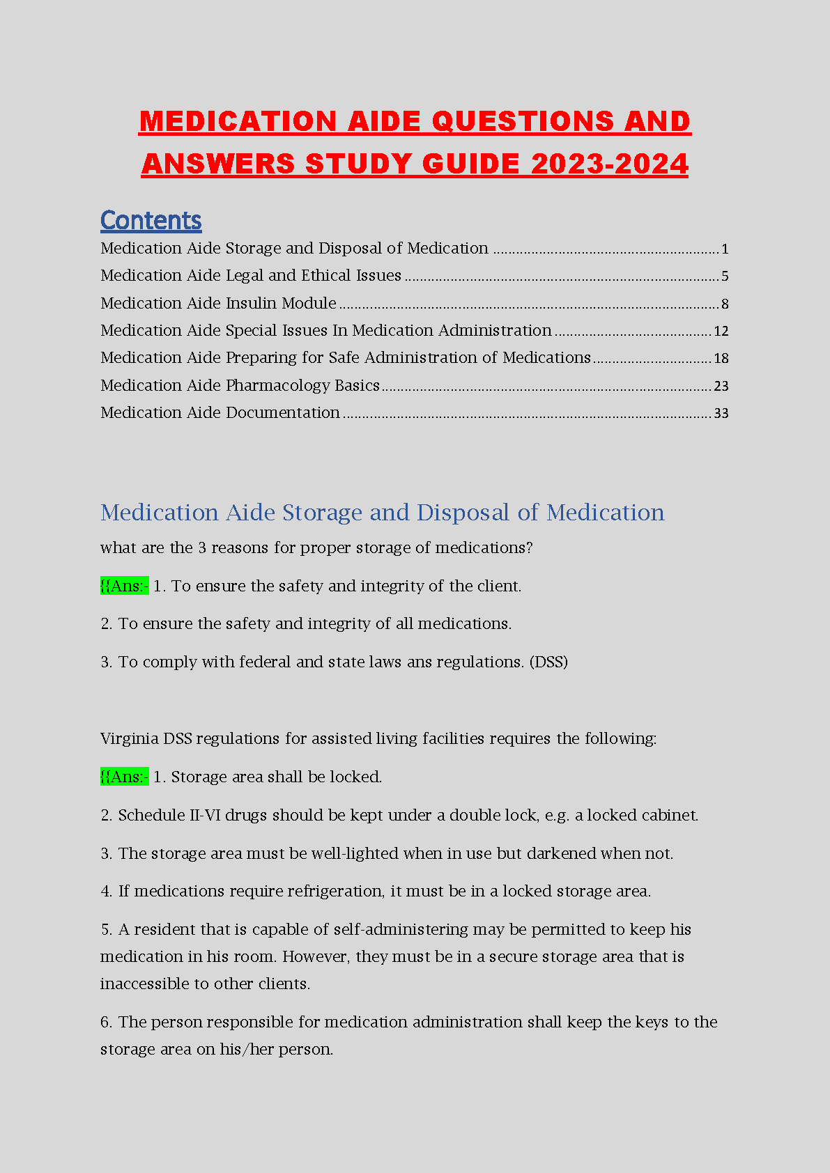 Get ready to ace your Medication Aide exam with this comprehensive study guide covering all the key concepts and topics. Packed with questions and answers, this resource will help you master medication storage, legal and ethical issues, administration techniques, and more. Boost your confidence and prepare for success on your first try!