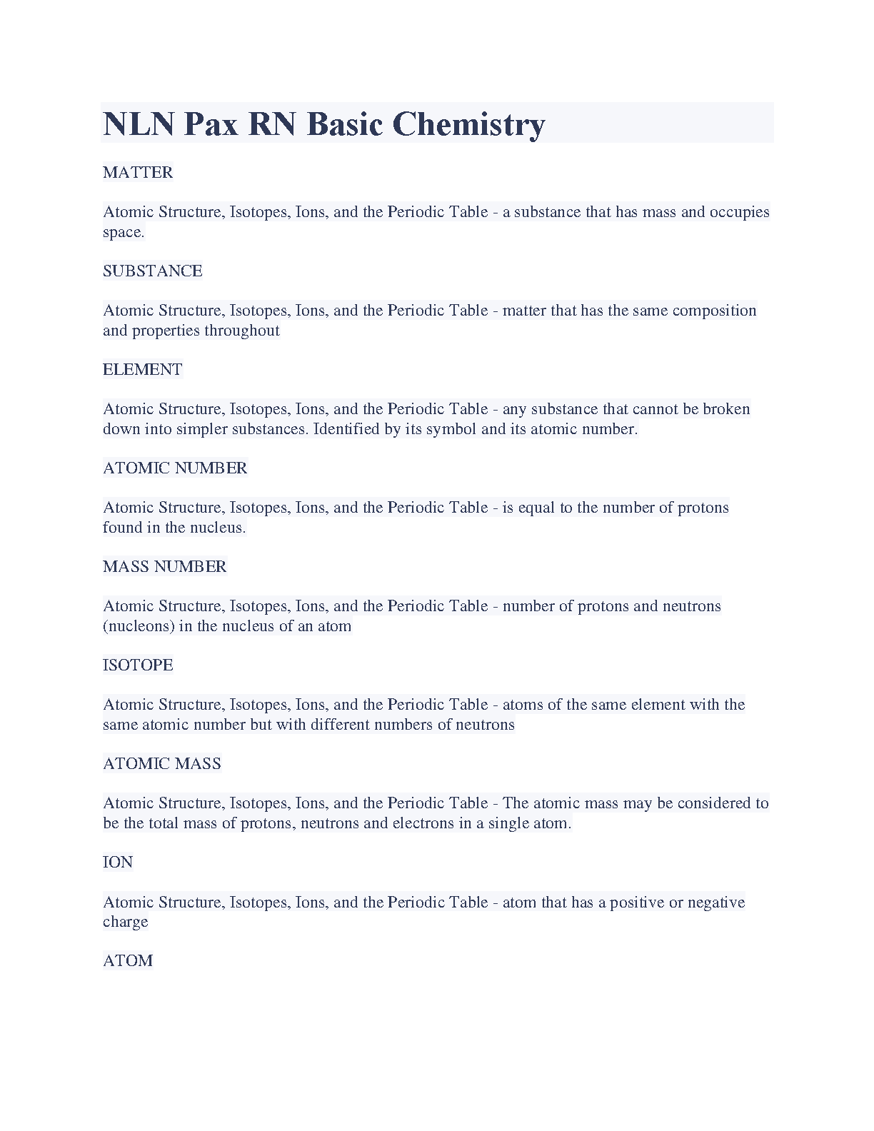 NLN Pax RN Basic Chemistry: A Comprehensive Guide to Mastering Chemistry for Nursing Students