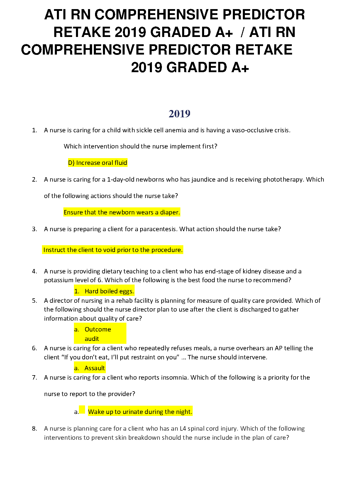 ATI RN Comprehensive Predictor Retake 2019 Graded A+ is a complete study guide designed to help you ace the NCLEX exam on your first attempt and avoid resits. Packed with practice questions, detailed explanations, and comprehensive coverage of all essential nursing concepts, this resource offers a powerful tool for your NCLEX preparation. Master the material, build confidence, and achieve your nursing goals.