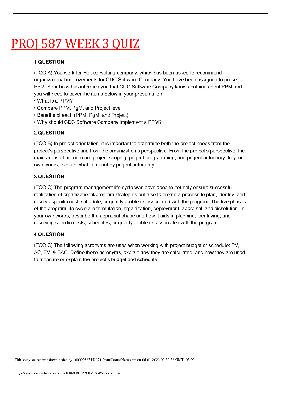 Prepare for success in PROJ 587 Week 3 with this comprehensive quiz resource. This file contains multiple choice questions designed to test your understanding of key concepts including project management life cycle, project autonomy, and project budget and schedule.