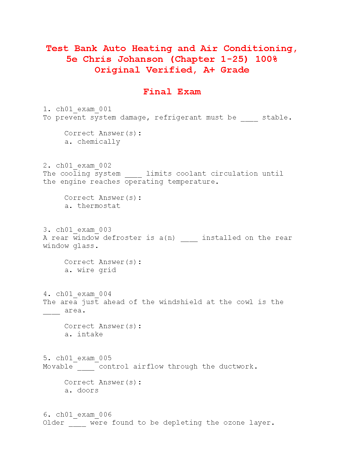 Test Bank Auto Heating and Air Conditioning, 5th Edition by Chris Johanson, Greg Banks and Michael Senick - 2024/2025 - Ace Your Exams on the First Attempt
